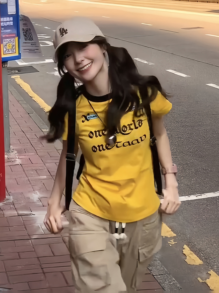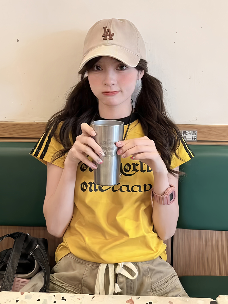 Retro Letter Print Short Sleeve Slim Fit Tops for Stylish Summer Fits