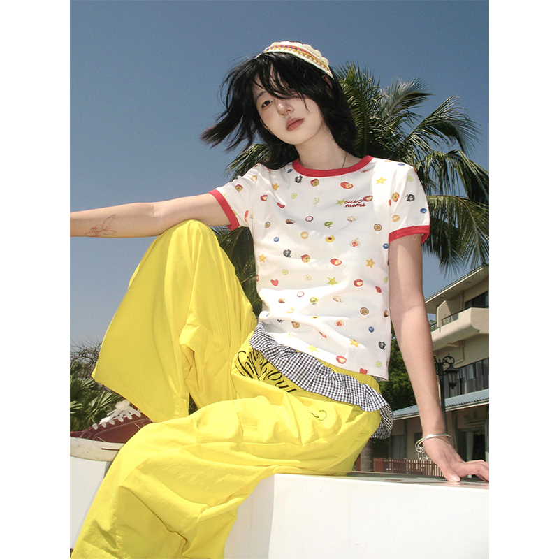 Retro Fruit Print Short Sleeve Women Slim Fit Neck College Summer Top High-quality product featuring casual summer outfits, spring outfit, fall fits and more. Modern design that fits the latest trends. Premium materials ensure durability and comfort. Order now for special offers! Product designed with attention to every detail. Suitable for all occasions and personal styles.