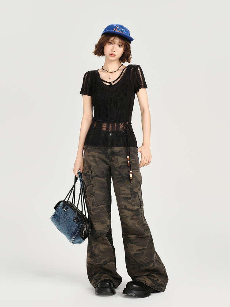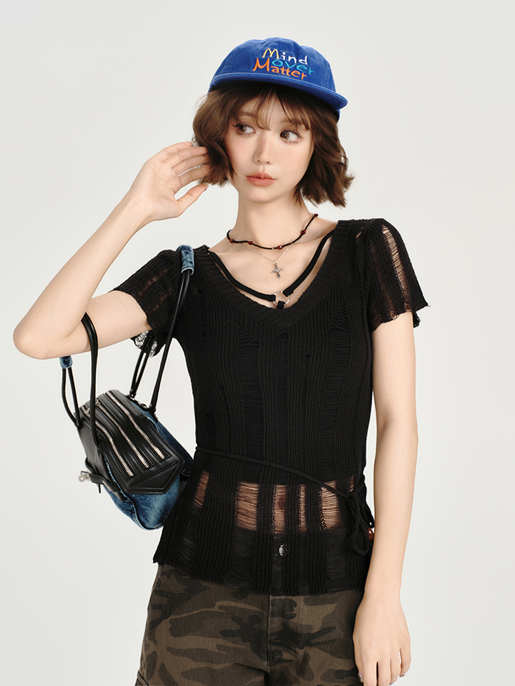 Elevate your summer wardrobe with our American Retro Hollowed-Out Ripped Short-Sleeve Cover-Up for Women. This chic slim-fit top features playful cutouts and distressed detailing, perfectly blending girly style with a trendy edge. Ideal for beach days or casual outings, it effortlessly complements your favorite shorts or skirts, ensuring you stay cool and stylish all season long. Don’t miss out on this must-have piece add it to your cart today!