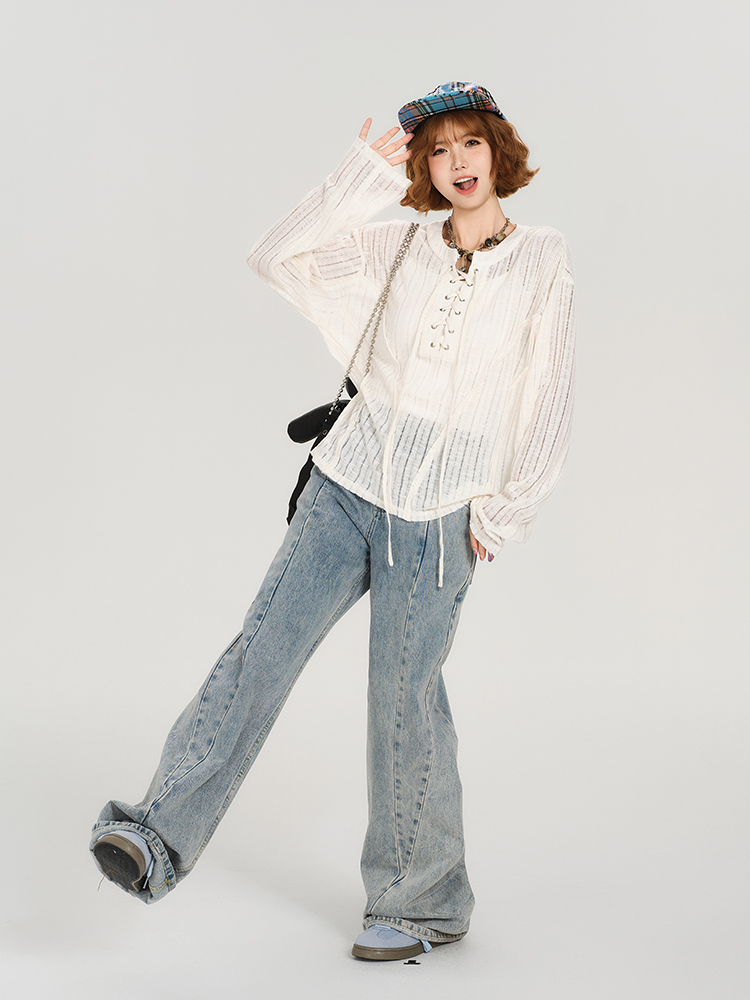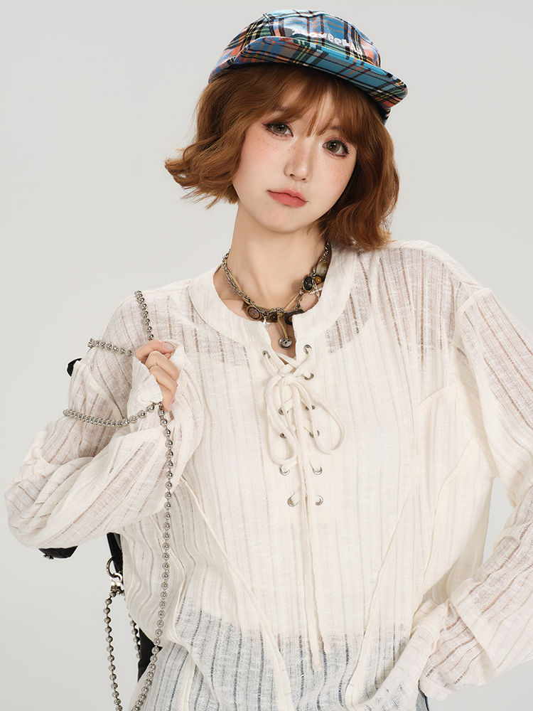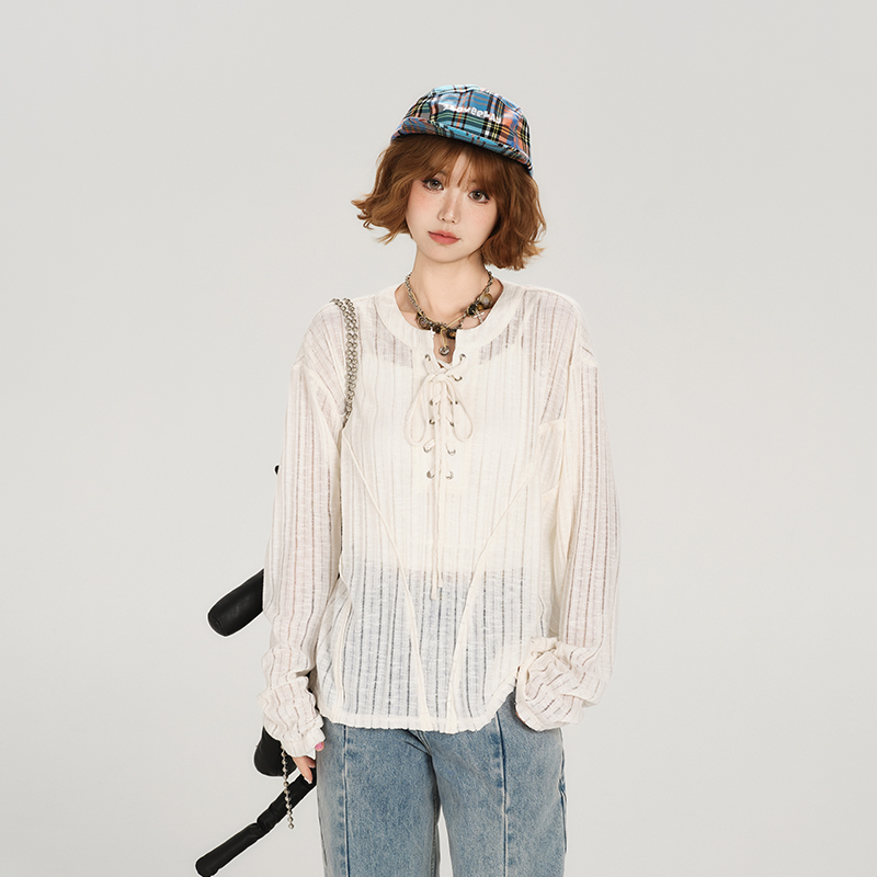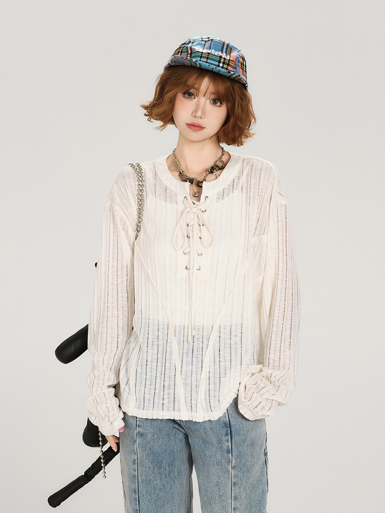 Retro Lace Up Hollow Sun Protection Shirt Women Summer Casual Loose Top