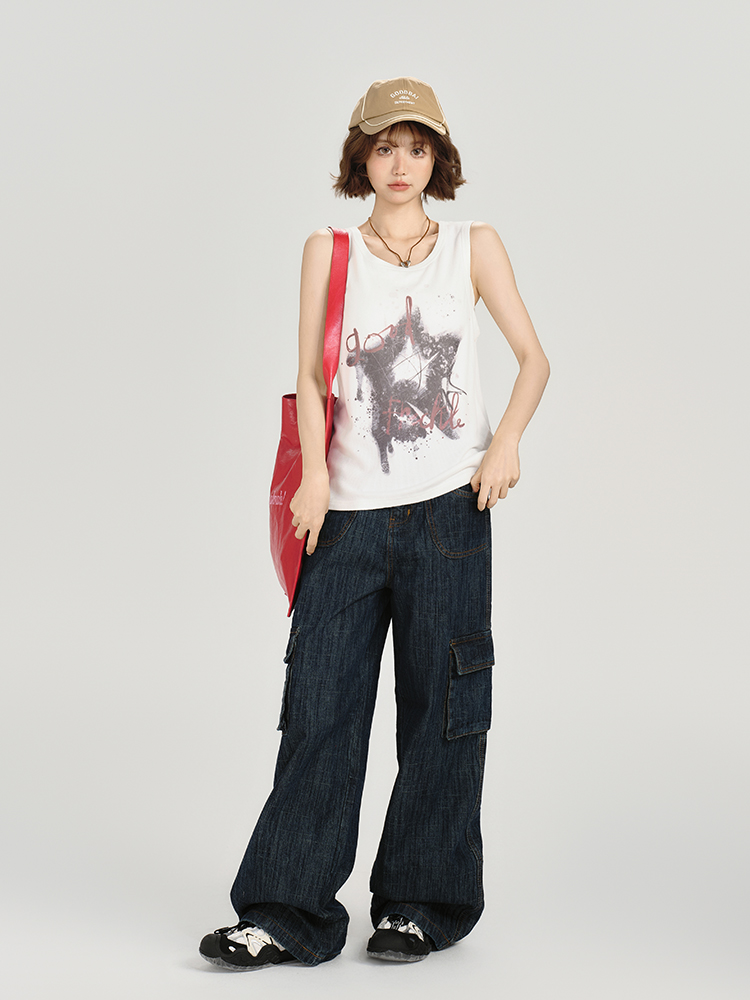 Retro Sleeveless Tank Top Women Summer Casual Printed, Loose Fit