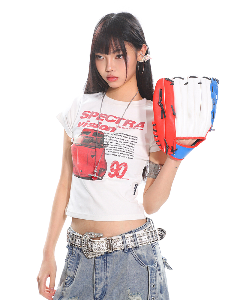 Vintage Car Print Women Summer Slim Fit Short Sleeve High Ela – Summer Fits