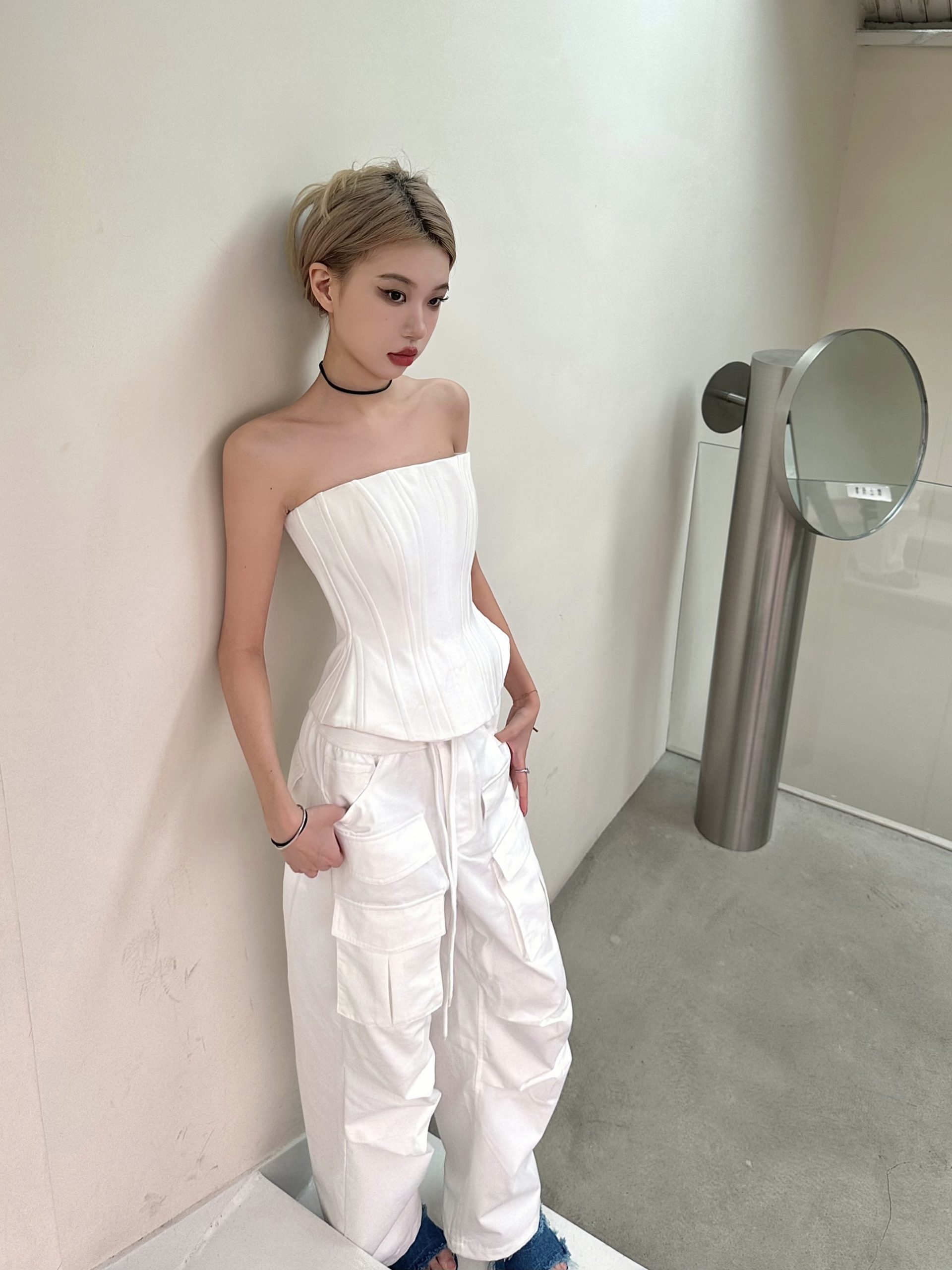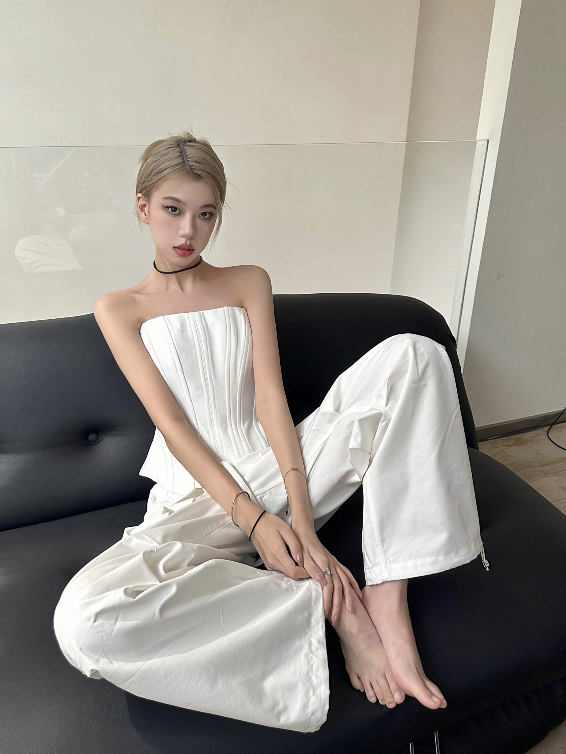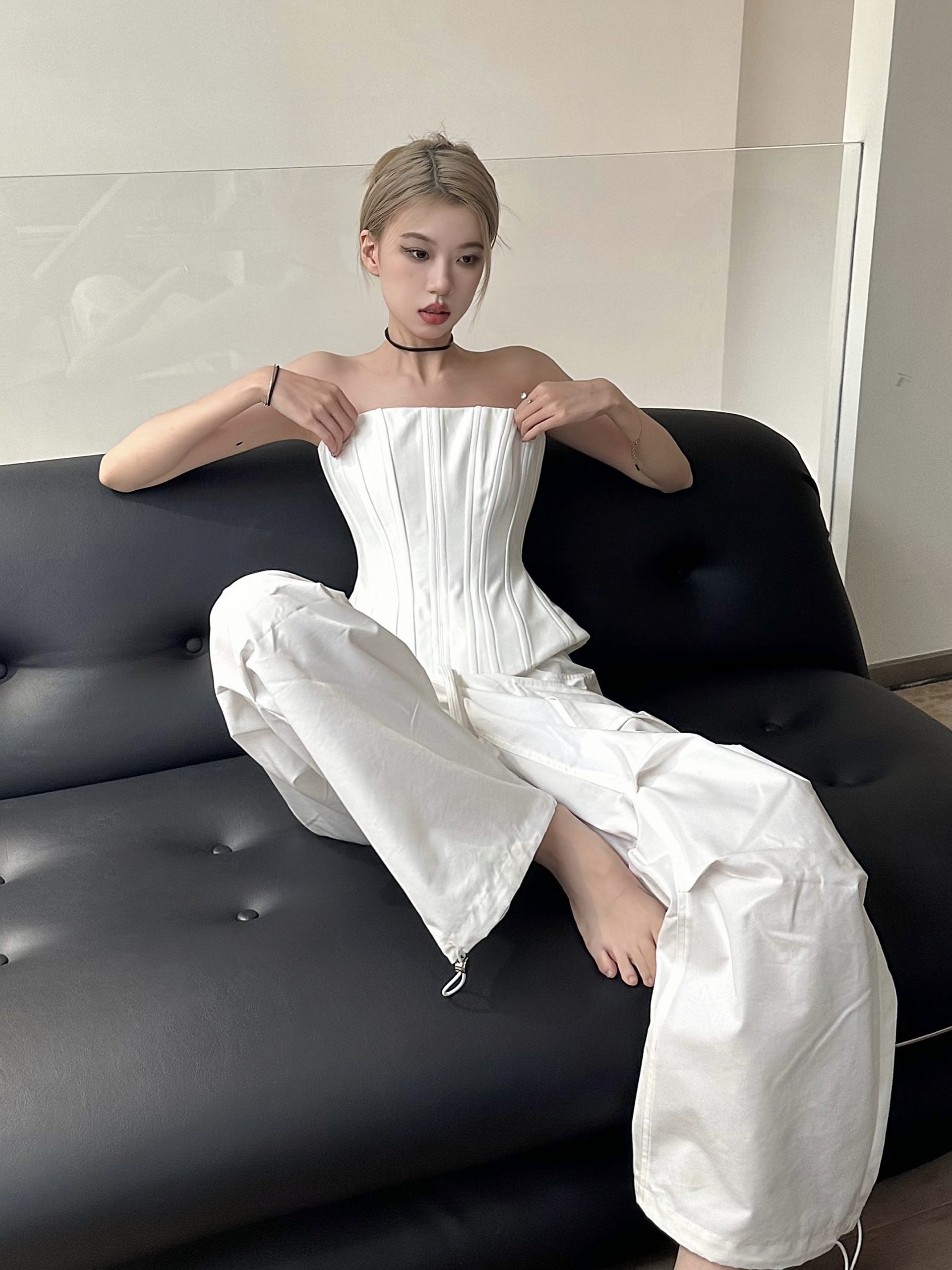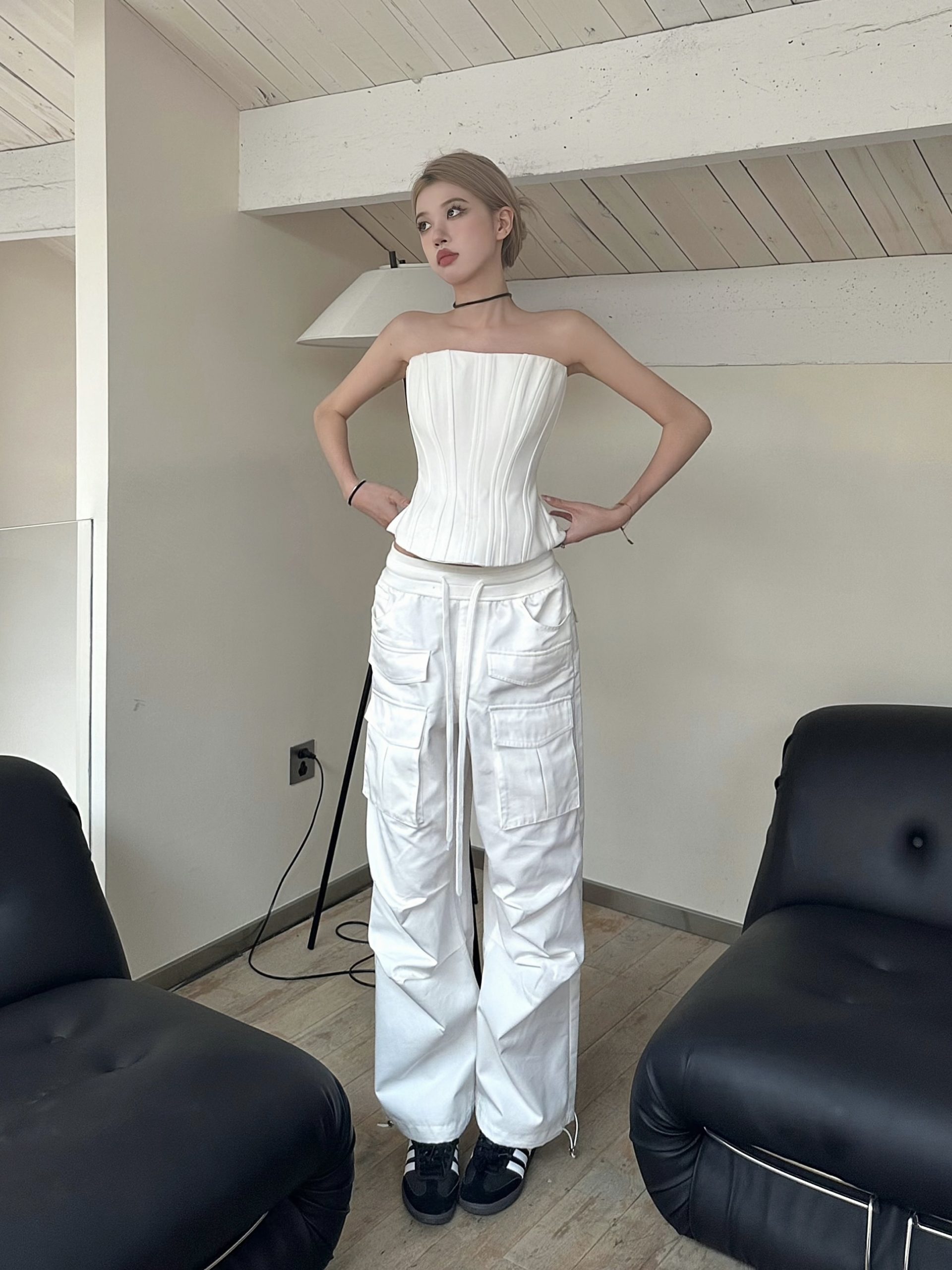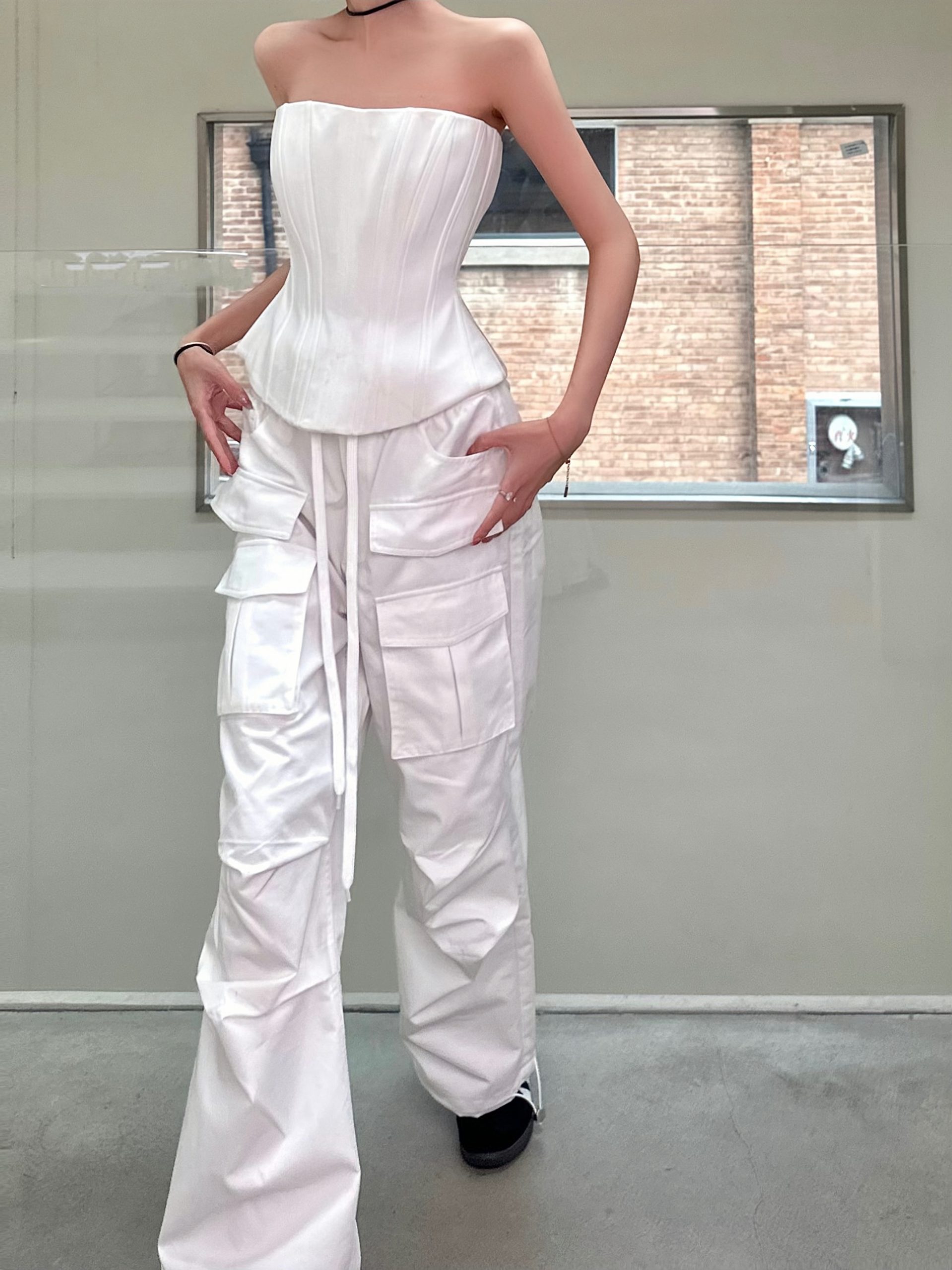 Elevate your cool Y2K workwear style with our striking Black and White Fishbone Strapless Top, featuring a flattering waist-cinching design that accentuates your silhouette. Paired with straight-leg parachute pants, this ensemble offers a perfect blend of comfort and chic sophistication, making it ideal for both office wear and after-work outings. Don’t miss out on this fashion-forward must-have add it to your cart today!