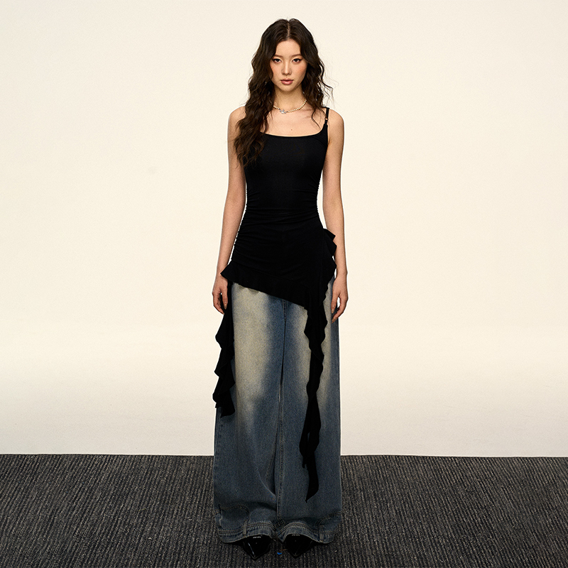 Elevate your summer wardrobe with our Black Irregular Symmetrical Strap Ruffled Sleeveless Top, designed for the ultimate hot girl vibes. This trendy piece features a unique asymmetrical strap design and playful ruffles that create a flattering silhouette, perfect for any casual outing or night out. Made from lightweight materials, it ensures comfort and breathability while keeping you stylish all day long. Don’t miss out on this must-have addition to your summer collection add it to your cart today!