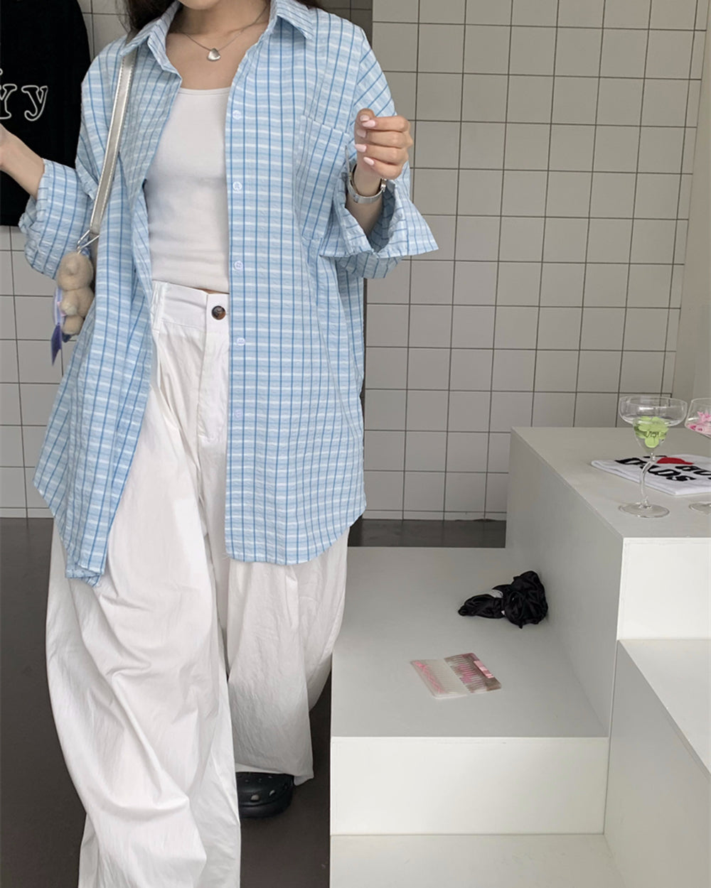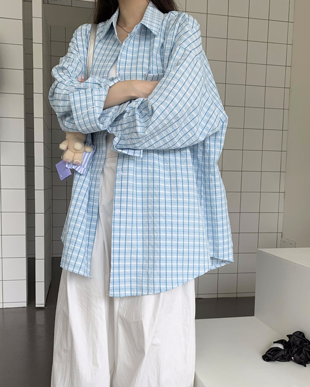 This oversized shirt features soft baby blue plaid, dropped shoulders, and a relaxed button-up cut
