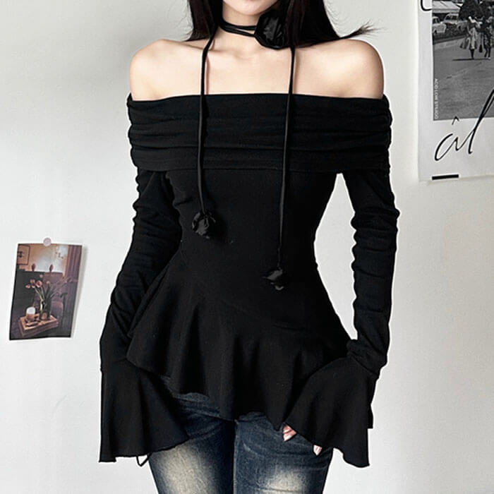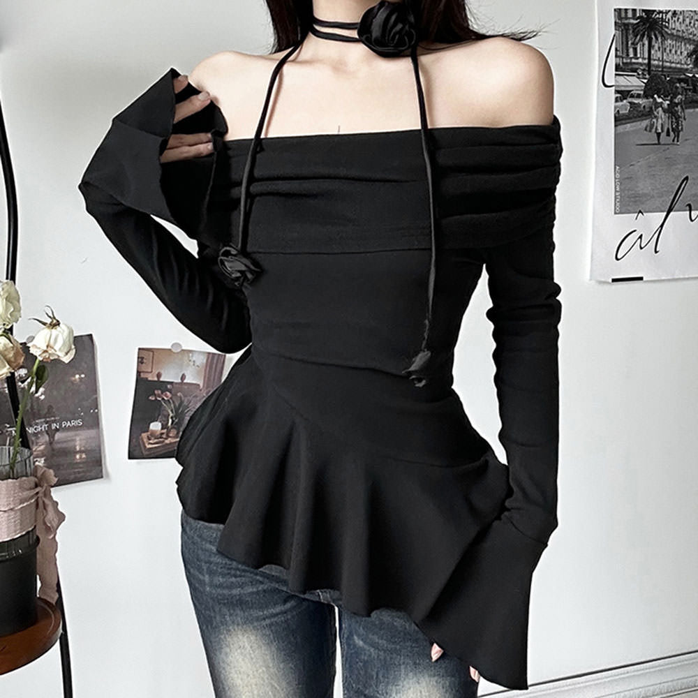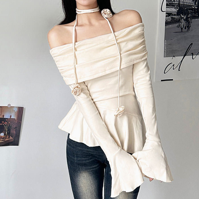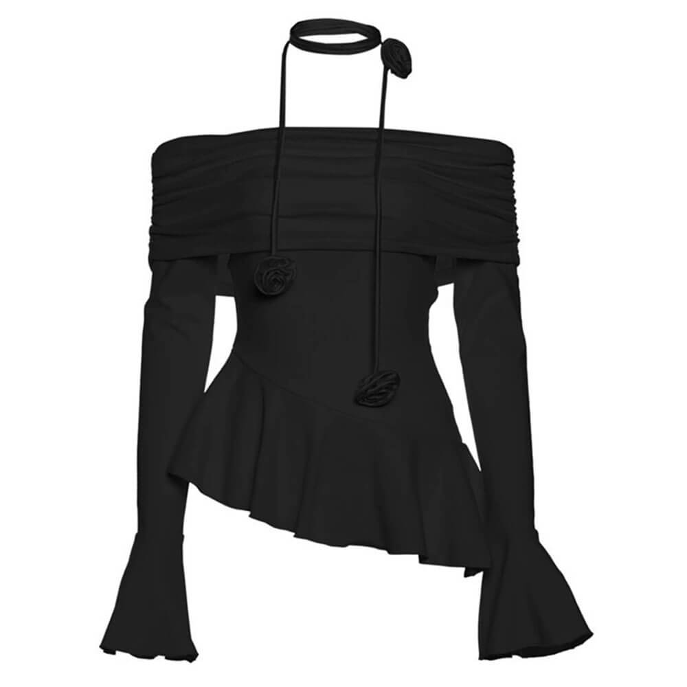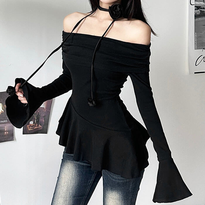 This stunning off-shoulder top featuring delicate ruched detailing and a statement rose choker. Its asymmetrical peplum hem and flared cuffs add a romantic touch.