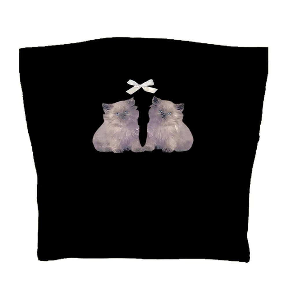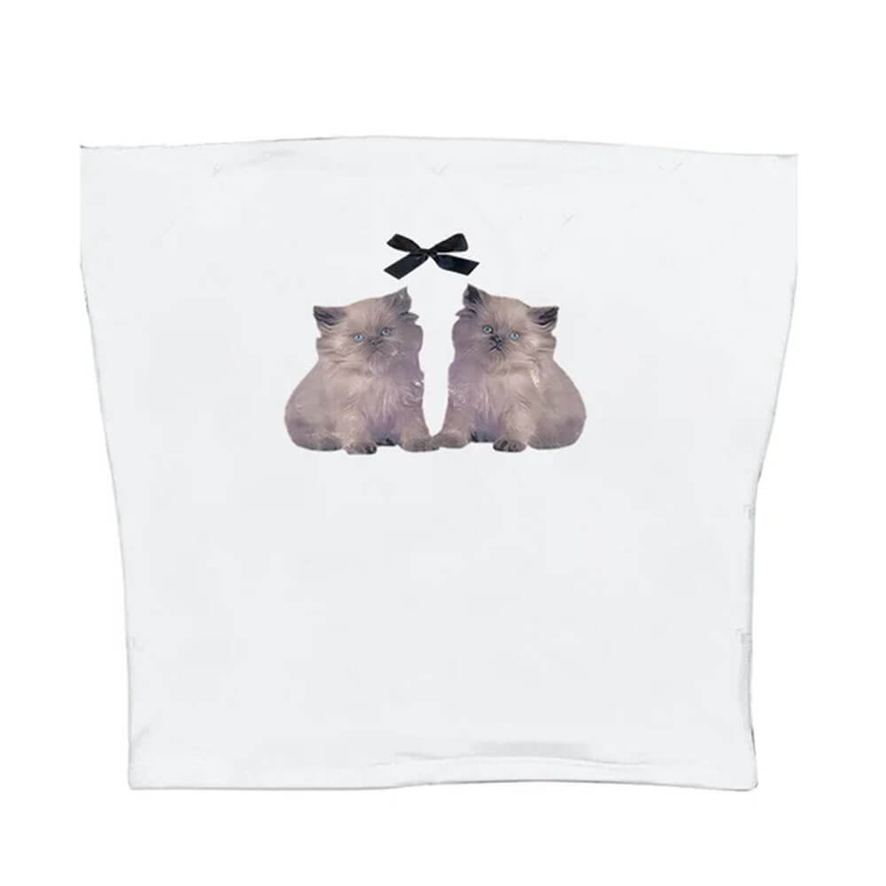 A strapless Y2K-style tube top featuring a graphic of twin kittens with a bow above them