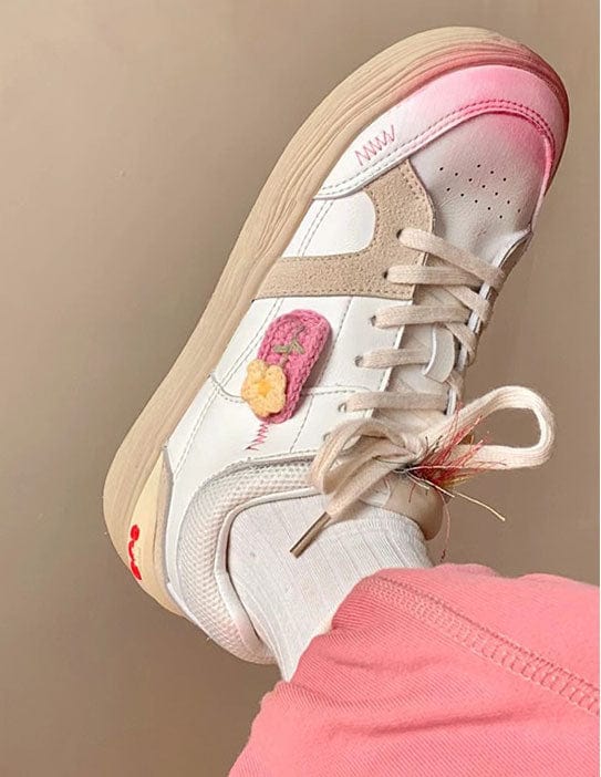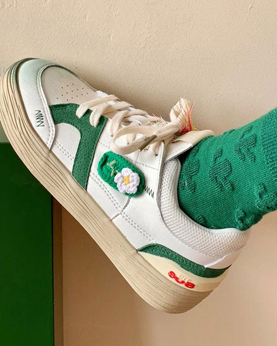 These cute sneakers have a vegan leather upper with a cottagecore aesthetic crochet flower detail, a low ankle rise and a lace up in front ✨