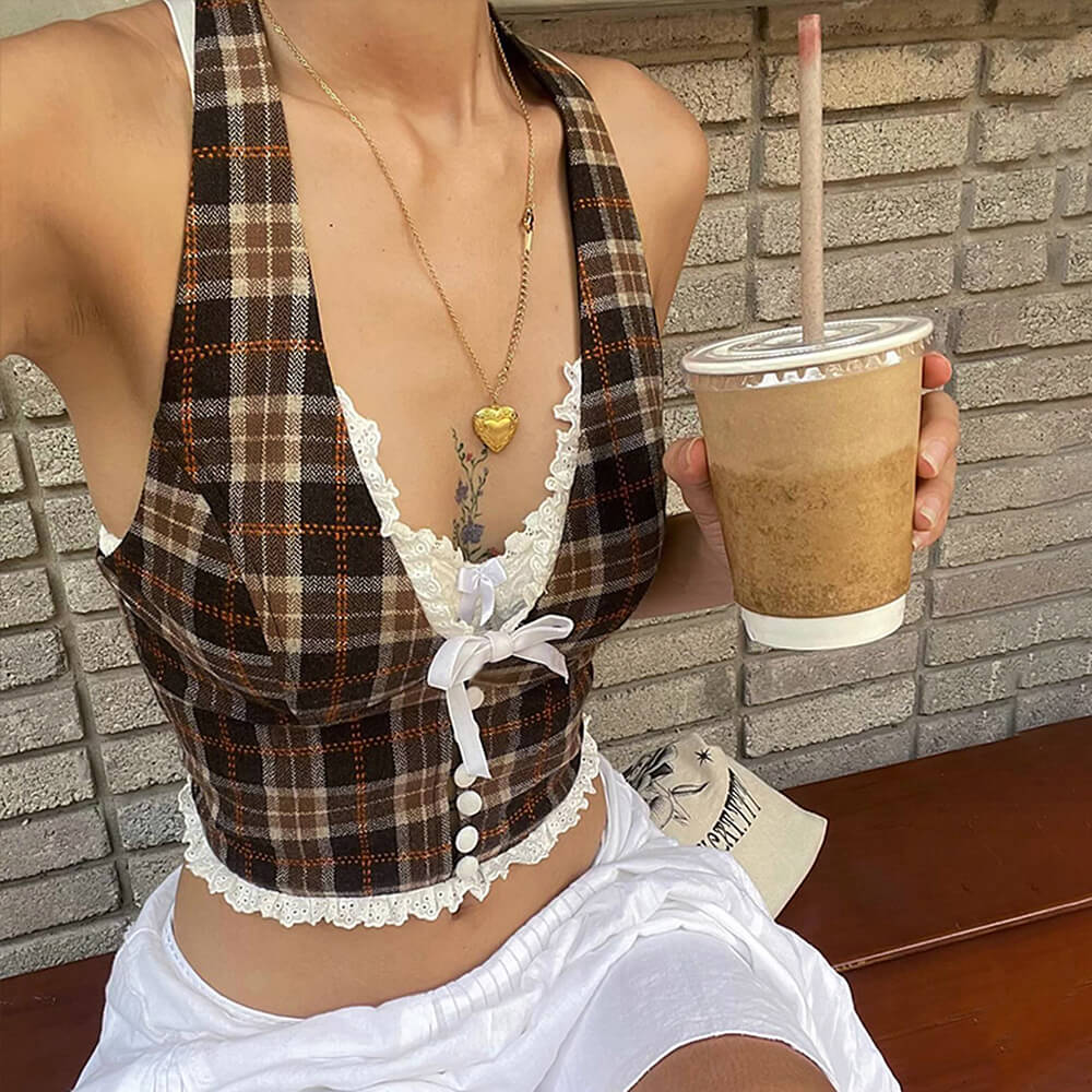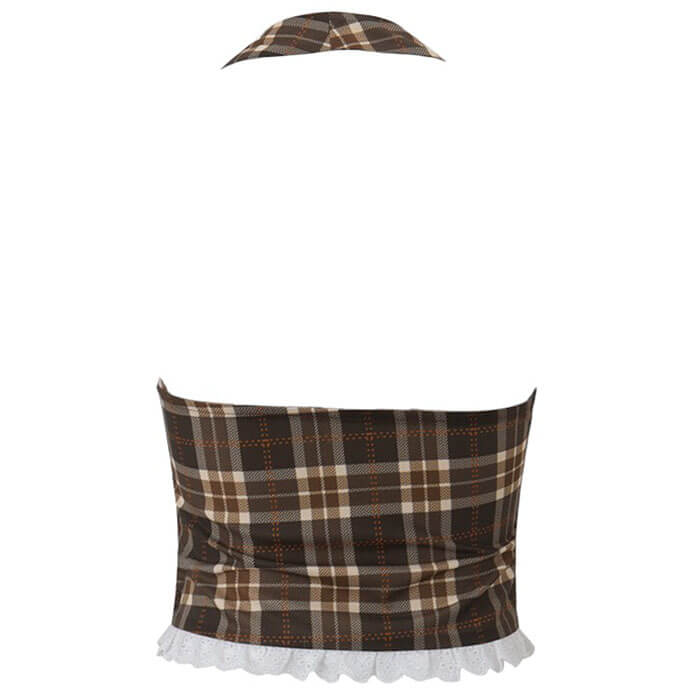 This cute halter top features a plaid print, lace trim, and a white ribbon bow