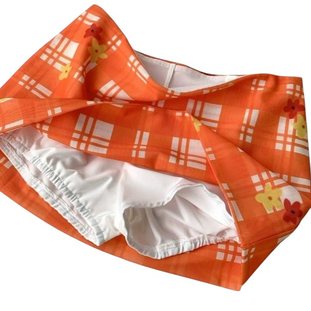 This vibrant mini skirt features a playful orange gingham print with scattered floral accents. Made from soft, stretchy fabric, it offers a flattering body-hugging fit—perfect for summer outings or beachside strolls