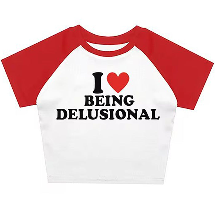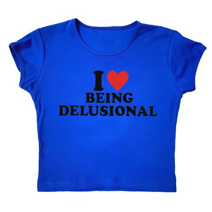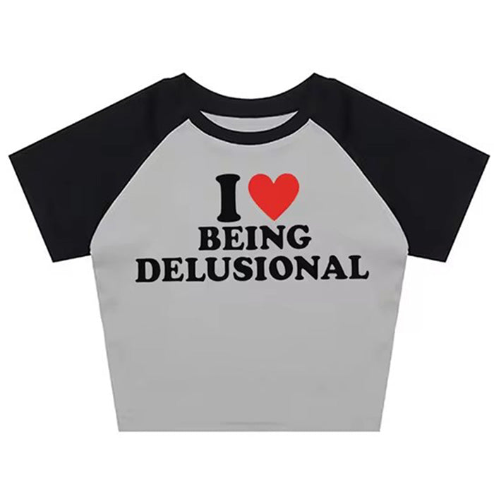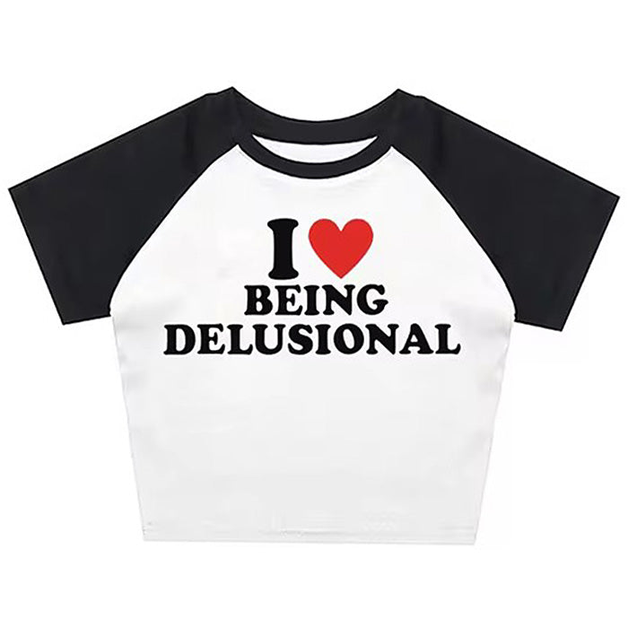Y2K crop top with ‘I Love Being Delusional’ text on the front