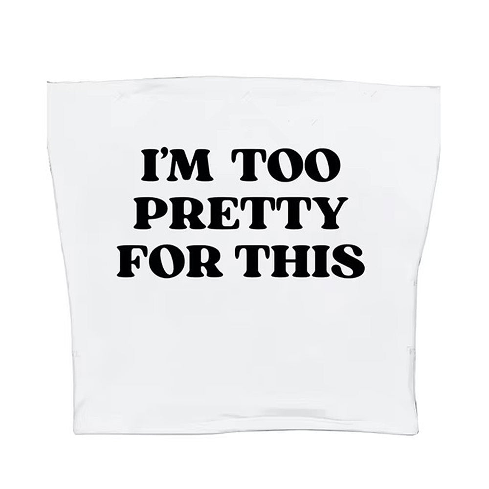 Y2K tube top with ‘I’m Too Pretty For This’ text on the front