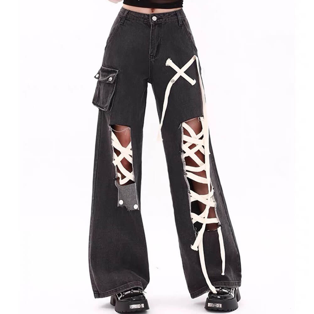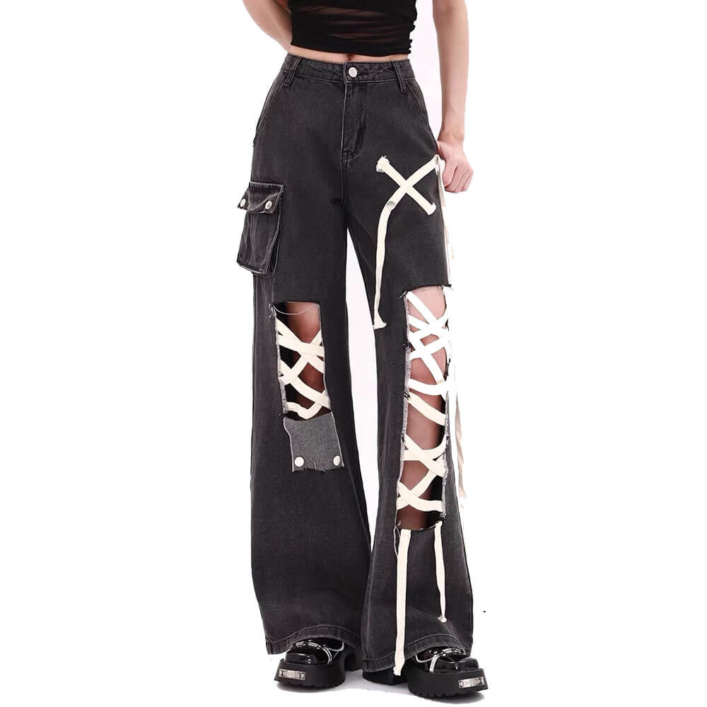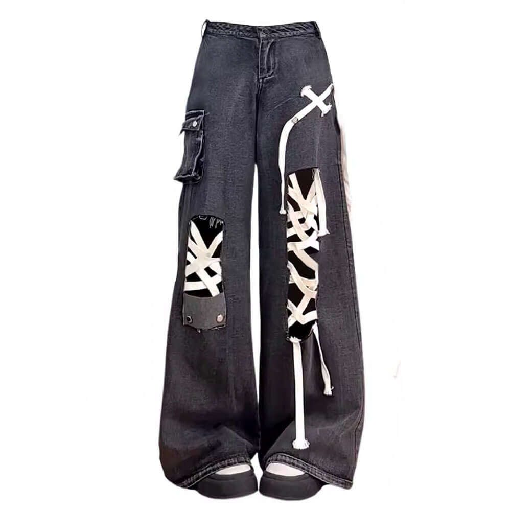 Black wide-leg jeans with a bold coquette aesthetic, featuring white lace-up details along the legs and patch pockets. The dark wash is accented with contrasting stitching and metal hardware.