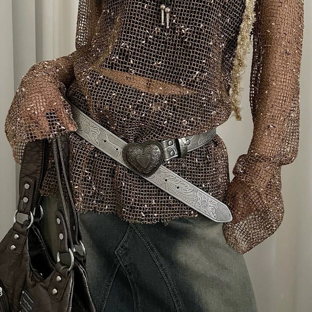 This aesthetic heart buckle belt features an engraved silver design with intricate patterns and a bold heart-shaped buckle