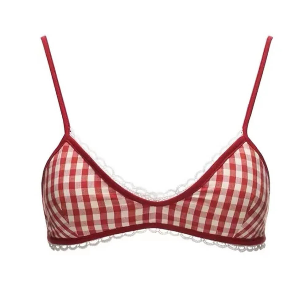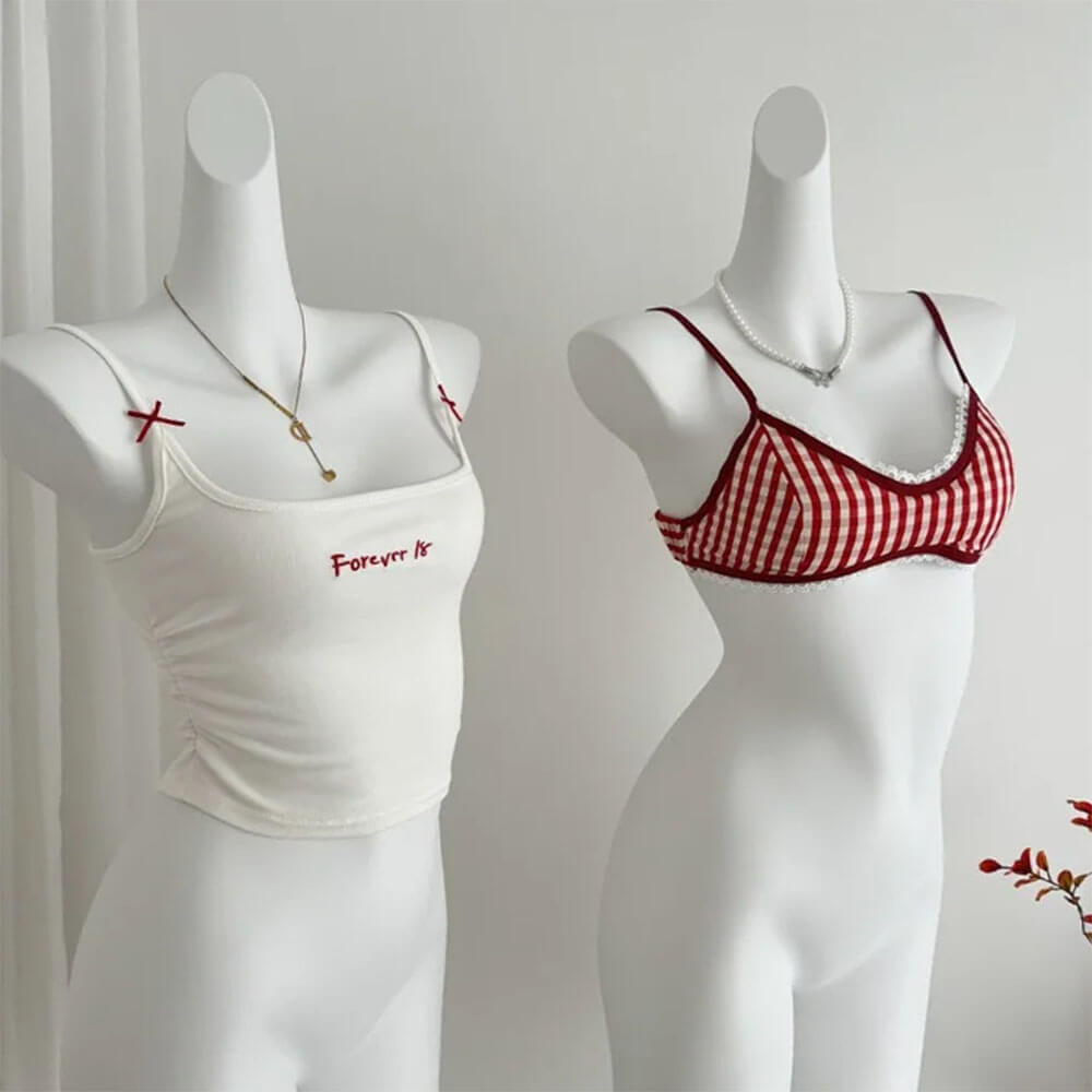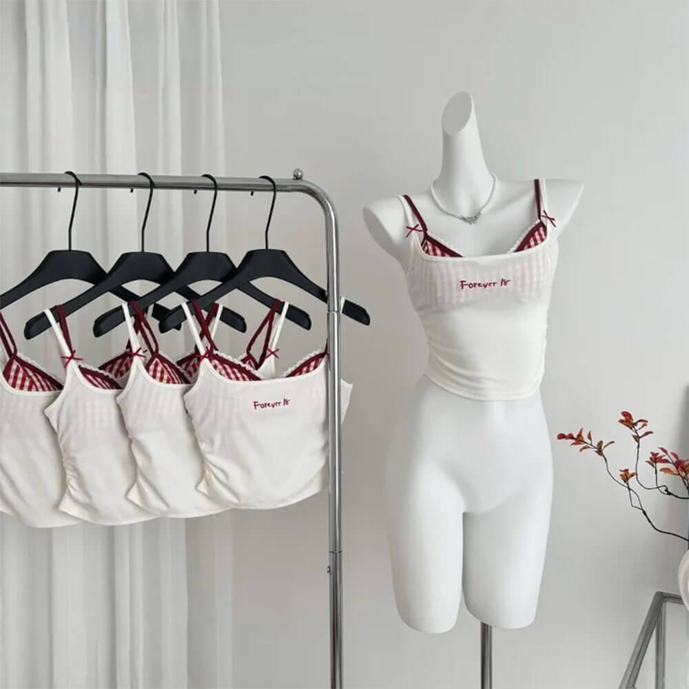 Y2K layered tank top featuring a red gingham bra design, lace trim, and ‘Forever 18’ print on a white outer layer