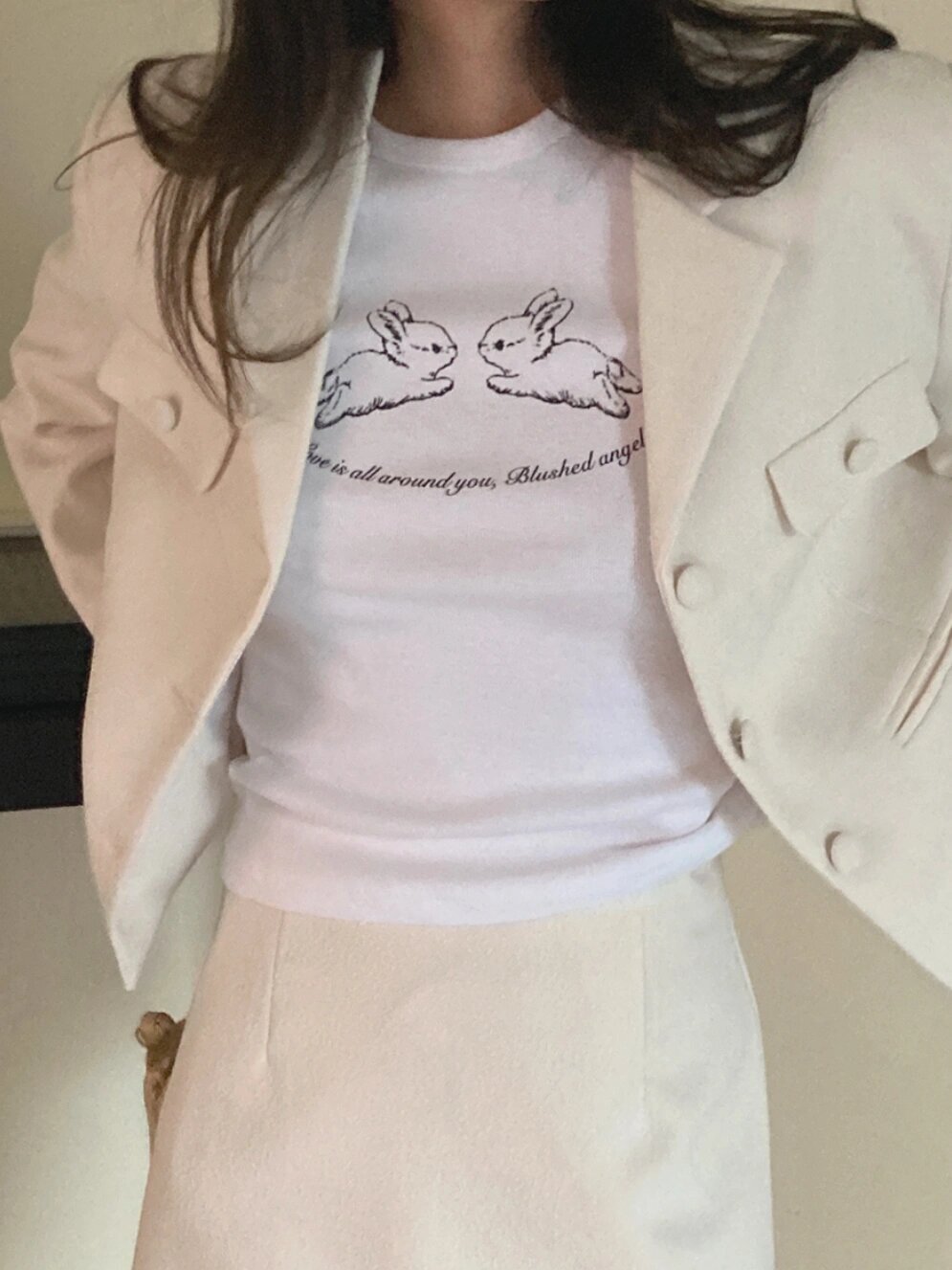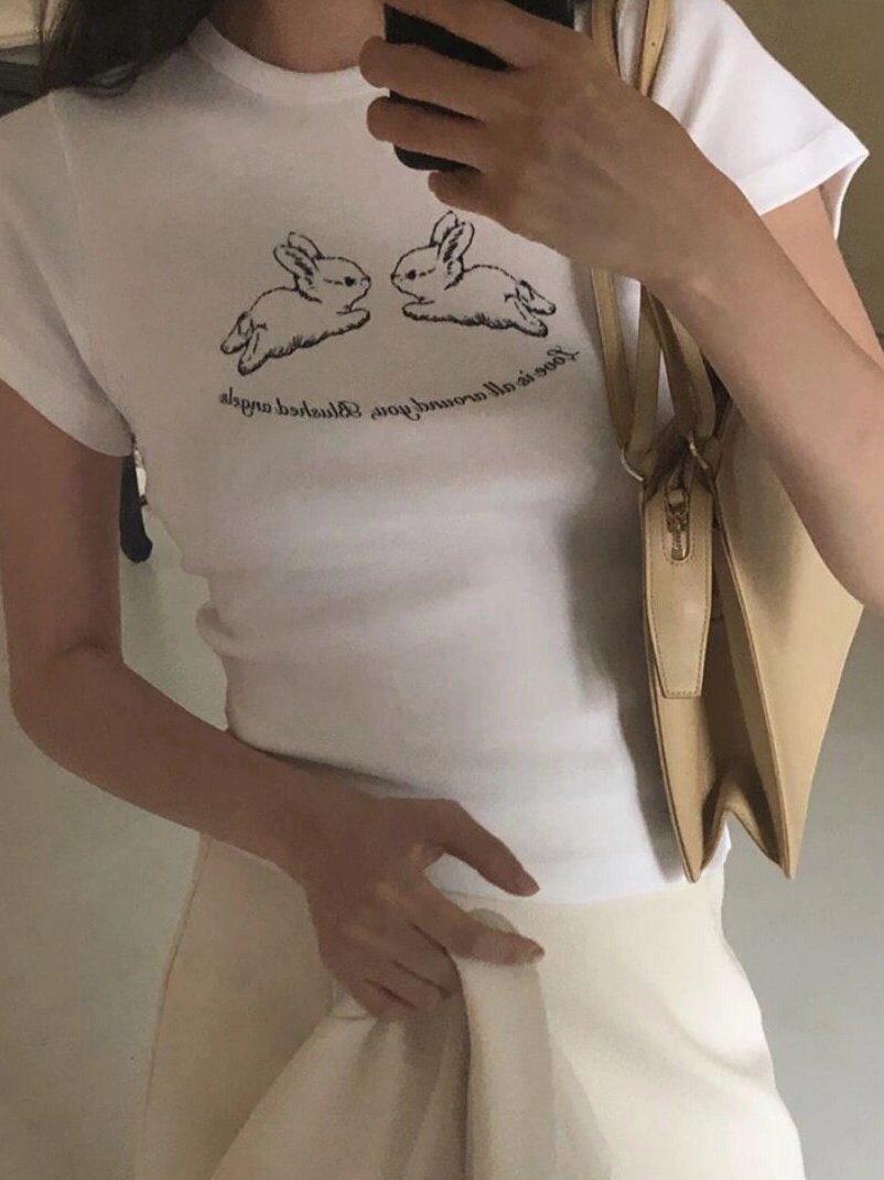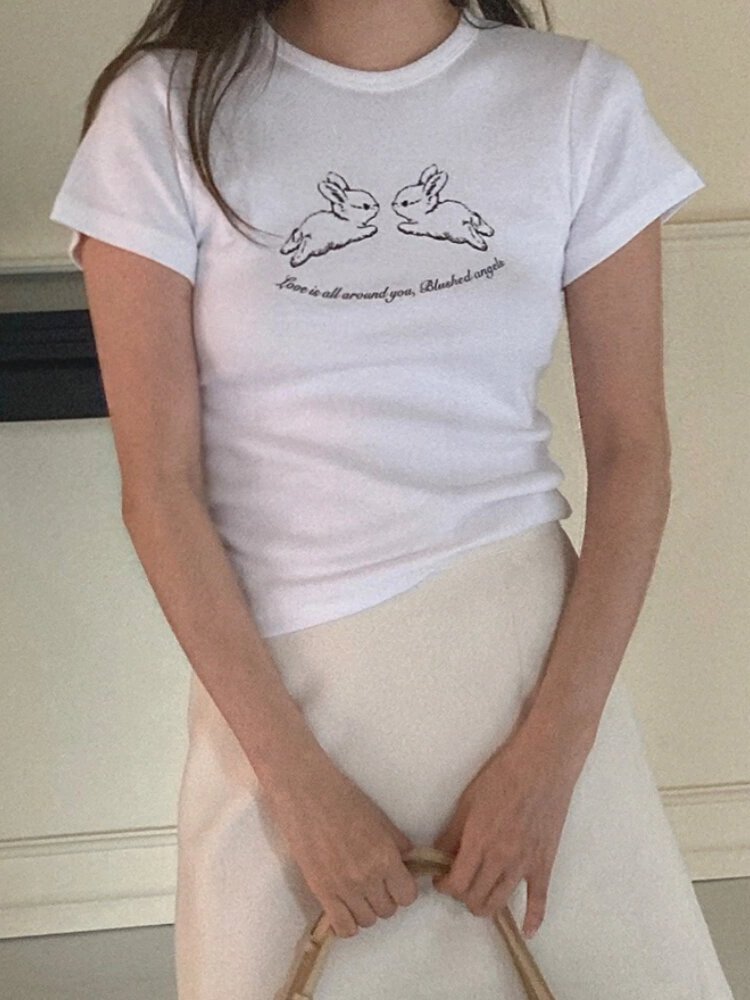 Elevate your casual wardrobe with our Cute Rabbit Print Slim Fit Short Sleeve Cotton T-Shirt for Women. This trendy Korean niche design features a playful rabbit print, crafted from heavyweight fabric for durability and a flattering fit. Embrace comfort and style effortlessly perfect for any occasion. Add this charming tee to your collection and make a statement today! Shop now.