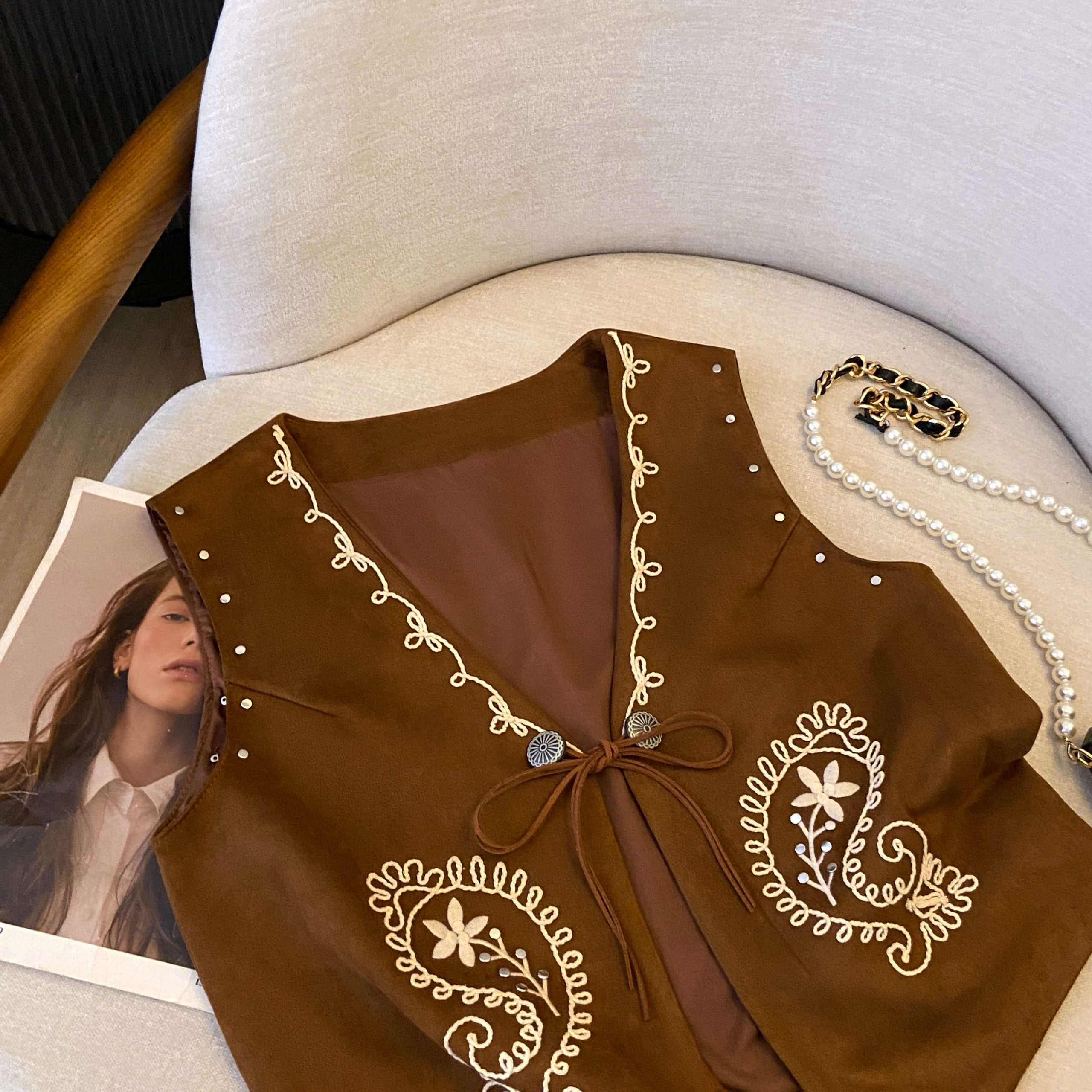 Elevate your vacation wardrobe with our Exotic Heavy Embroidery Studded Cashew Pattern Vest, a stunning retro suede cardigan that embodies boho chic style. This travel essential features intricate embroidery and a unique cashew pattern, making it the perfect layering piece for any outfit. With its relaxed fit and luxurious feel, this versatile vest effortlessly transitions from day to night. Don’t miss out on adding a touch of exotic flair to your collection shop now and make a style statement!