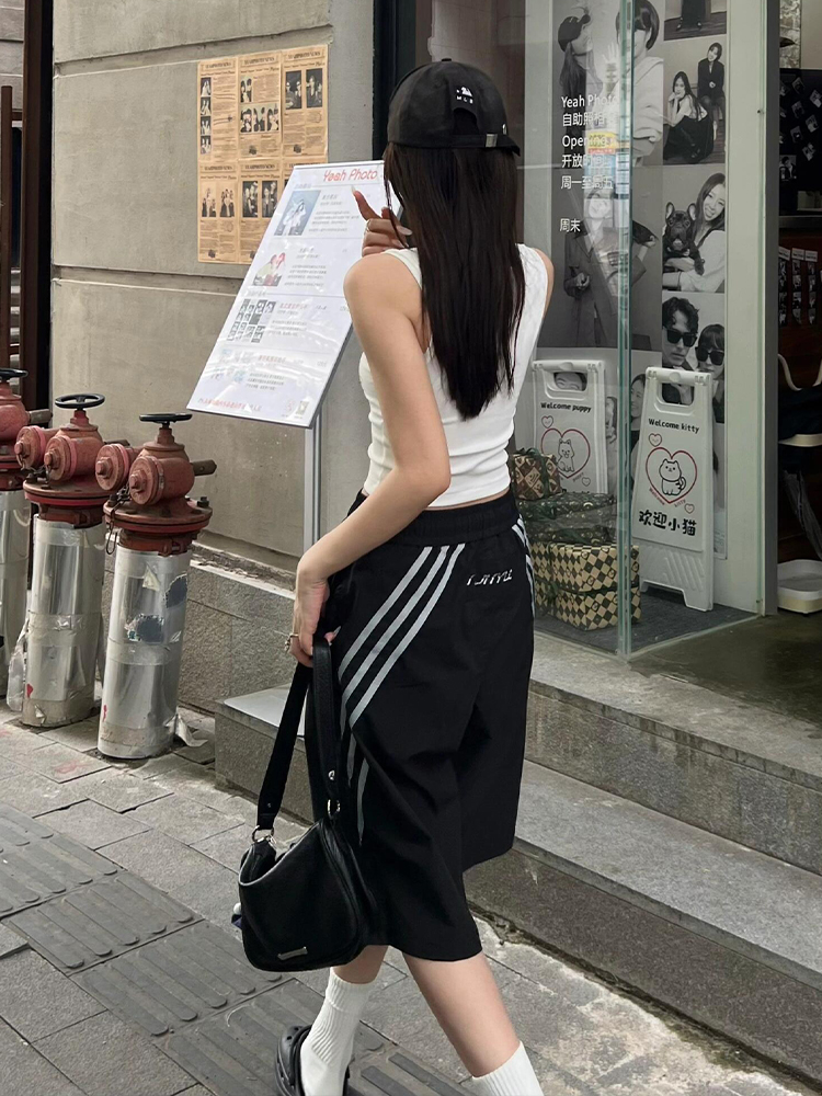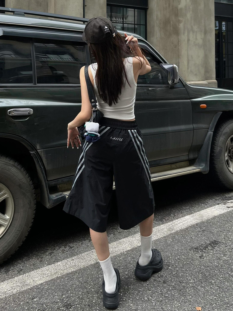 Vintage Black Shorts Women Summer Loose Fit Three Stripe Cropped Wide Leg Sports Pants High-quality product featuring fall fits, casual summer outfits, vacation outfits and more. Modern design that fits the latest trends. Premium materials ensure durability and comfort. Order now for special offers! Product designed with attention to every detail. Suitable for all occasions and personal styles.