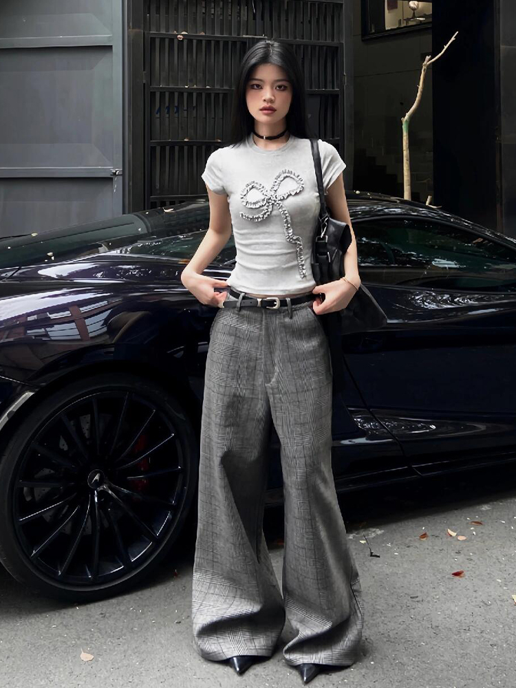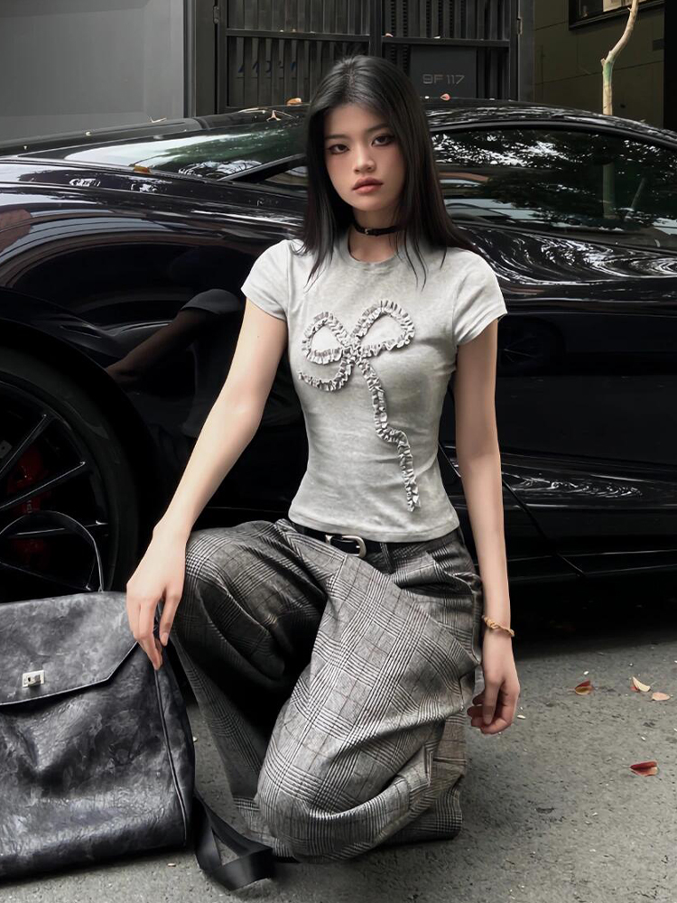 Vintage Slim Fit Top: Women’s Summer Fits with Pleated Bow Short Sleeves