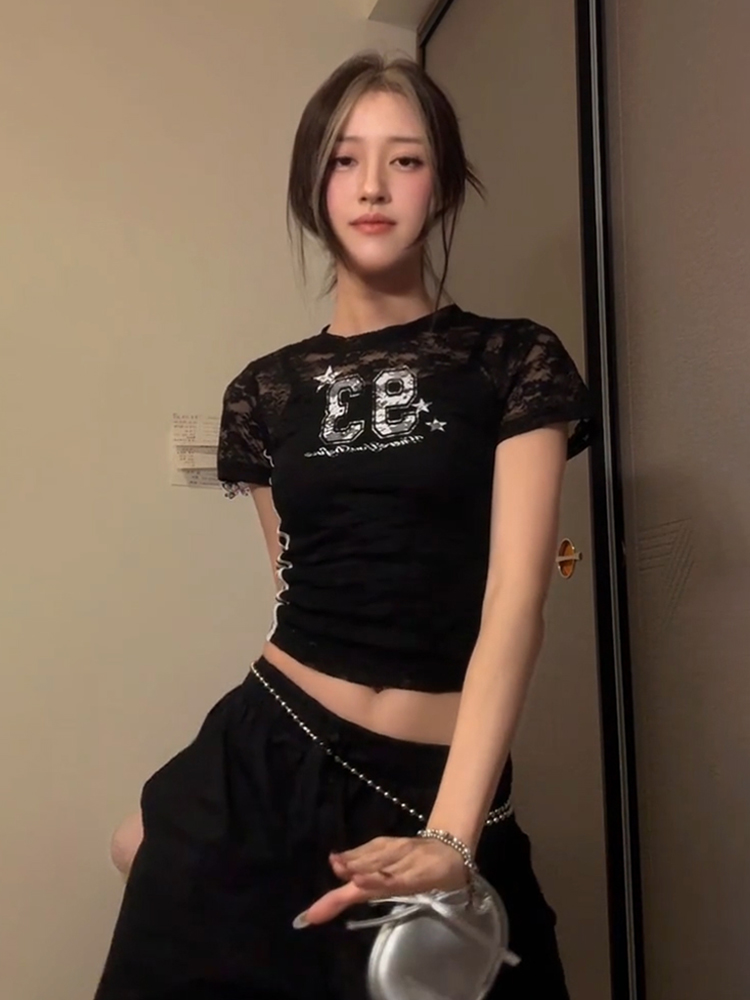 Hollowed Out Short Sleeve Print Jersey Slim Fit Summer Y2k to – Summer Fits