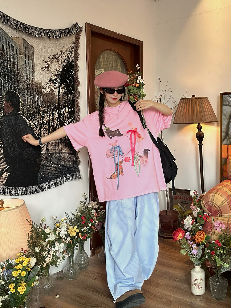 Retro Cute Cat Print Short Sleeve Women, Bow, Loose Fit, Y2k, – Y2k Outfits