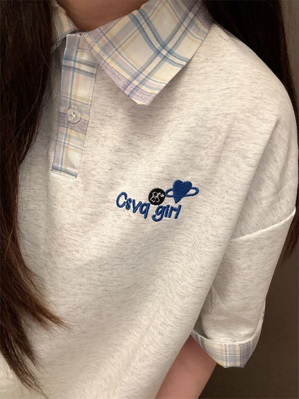 Elevate your summer wardrobe with our Korean-Style Plaid Spliced Polo Collar Embroidered Short Sleeve T-Shirt for Women. This stylish top combines a trendy plaid pattern with a classic polo collar, offering a chic yet comfortable fit perfect for college outings or casual dates. The embroidered details add a unique touch, making it a standout piece in any fashionista’s collection. Don’t miss out on this versatile addition add to your cart today and step out in style!