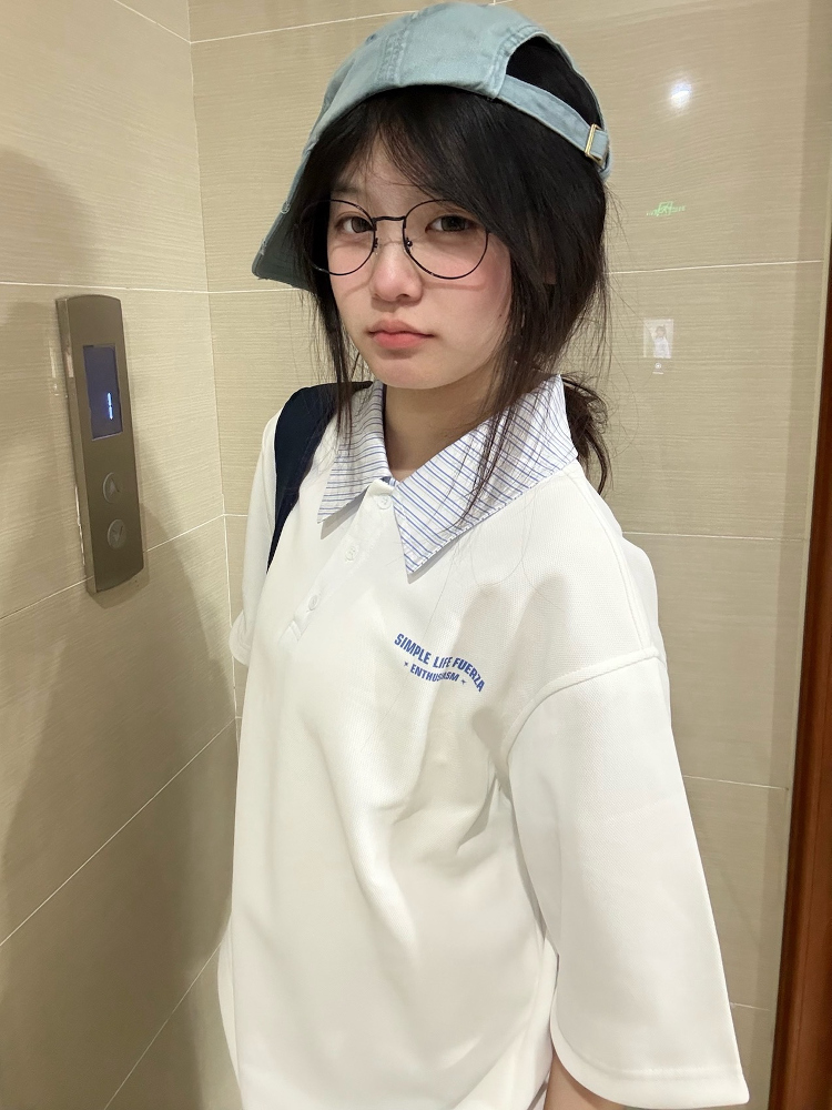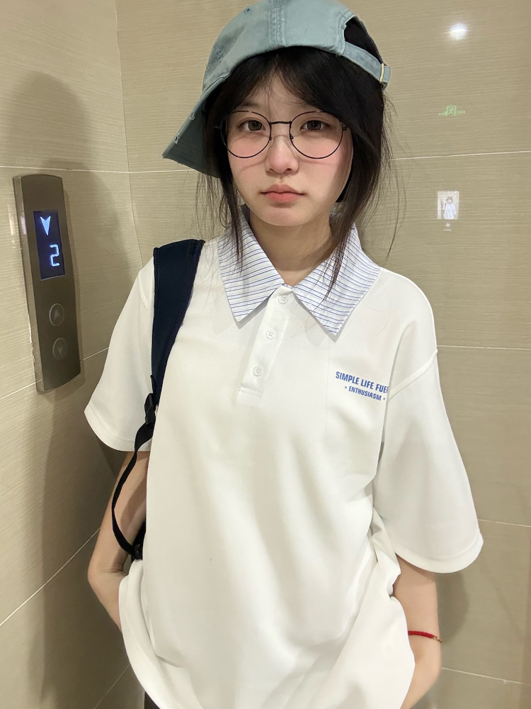 Korean Striped Patchwork Polo Collar White Short Sleeve Top for Summer Fits