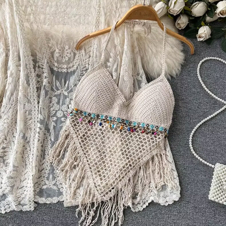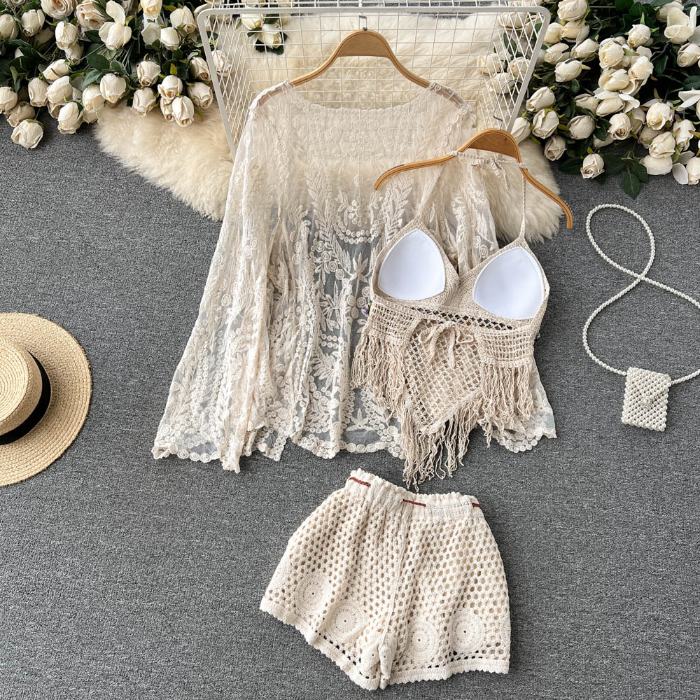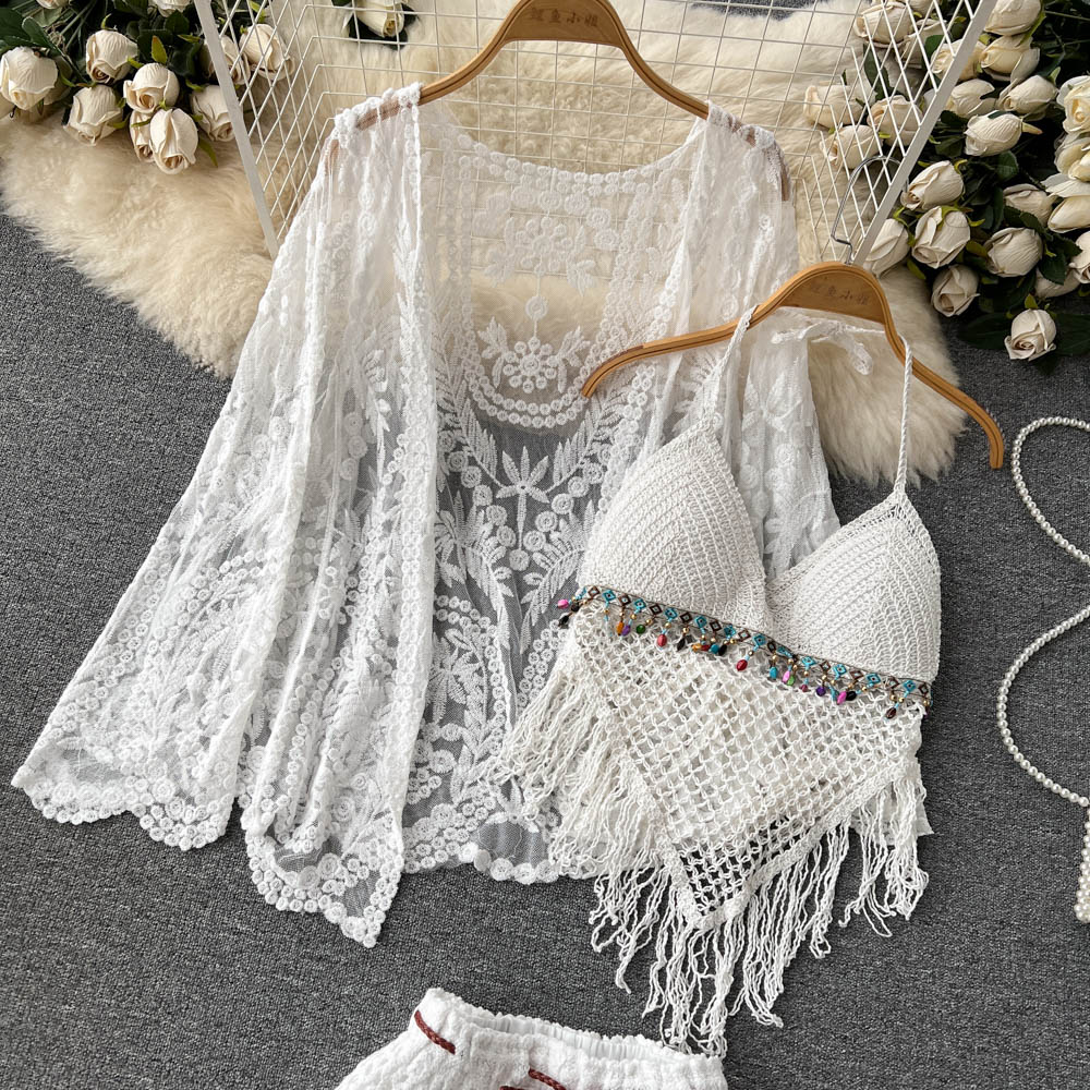 Lace Up Beach Cardigan Cover Up Set Knitted Fringe, Sun Protection Swimsuit Camisole Shorts High-quality product featuring holiday outfits, summer fits, outfit ideas and more. Modern design that fits the latest trends. Premium materials ensure durability and comfort. Order now for special offers! Product designed with attention to every detail. Suitable for all occasions and personal styles.