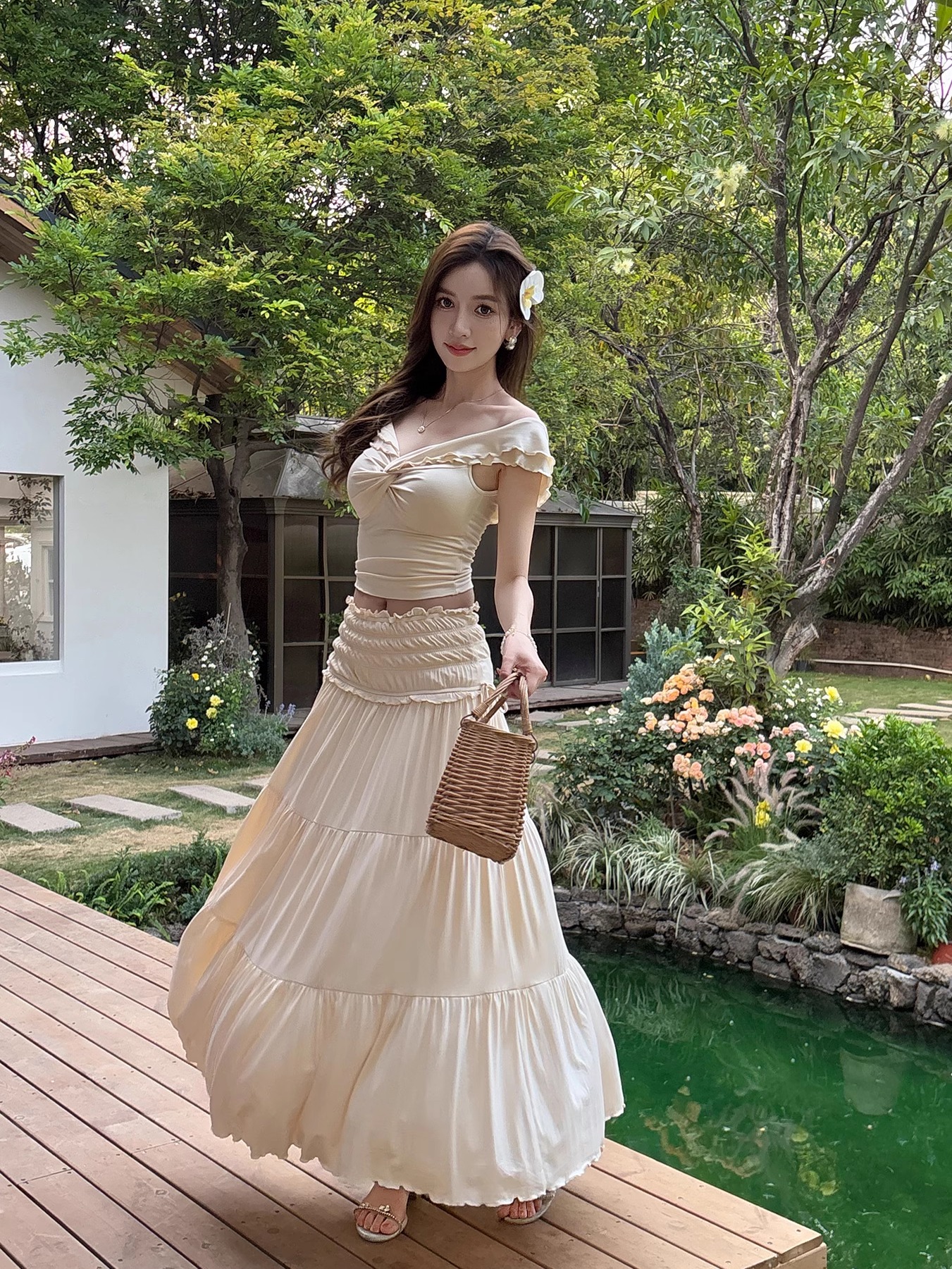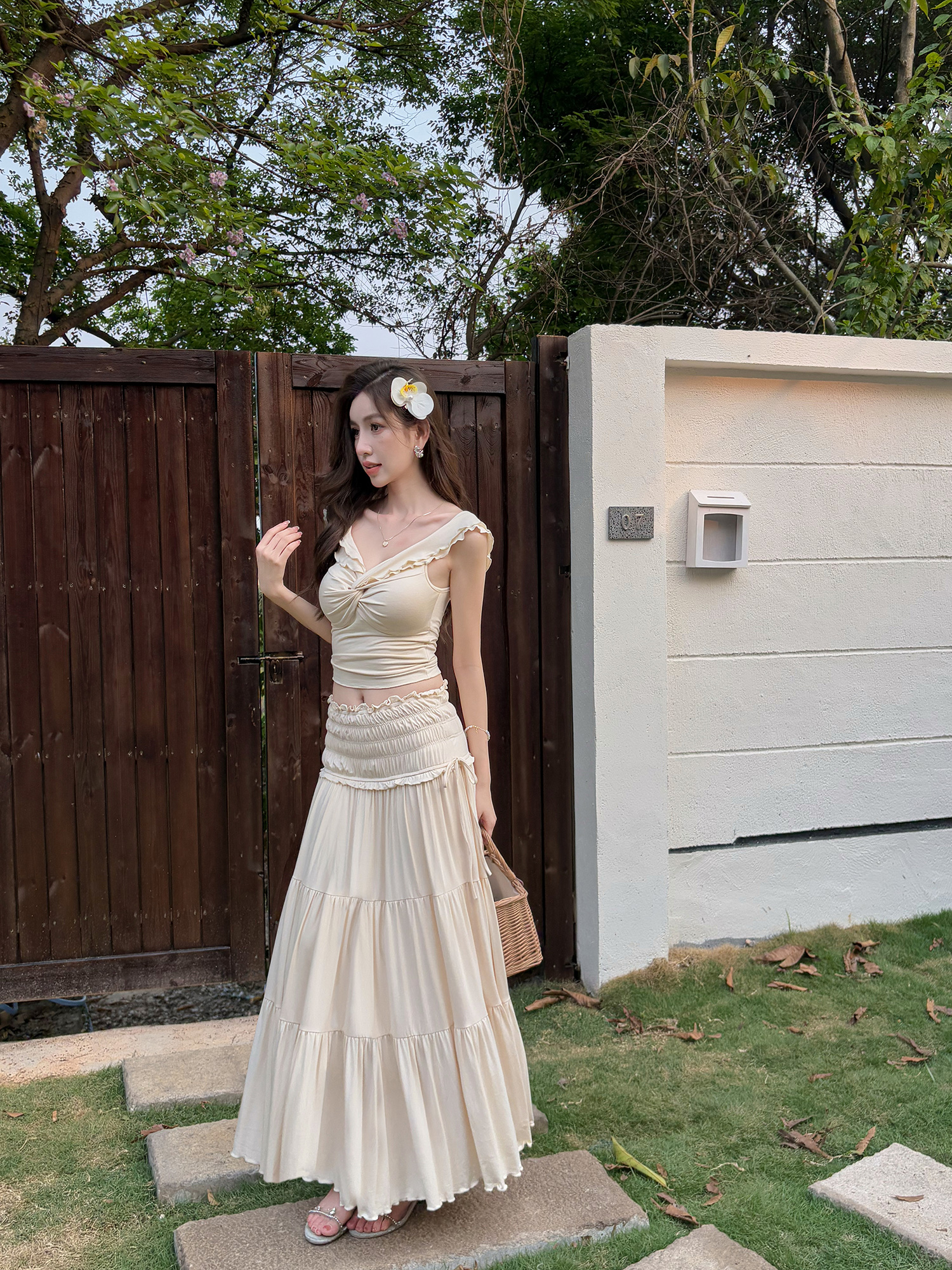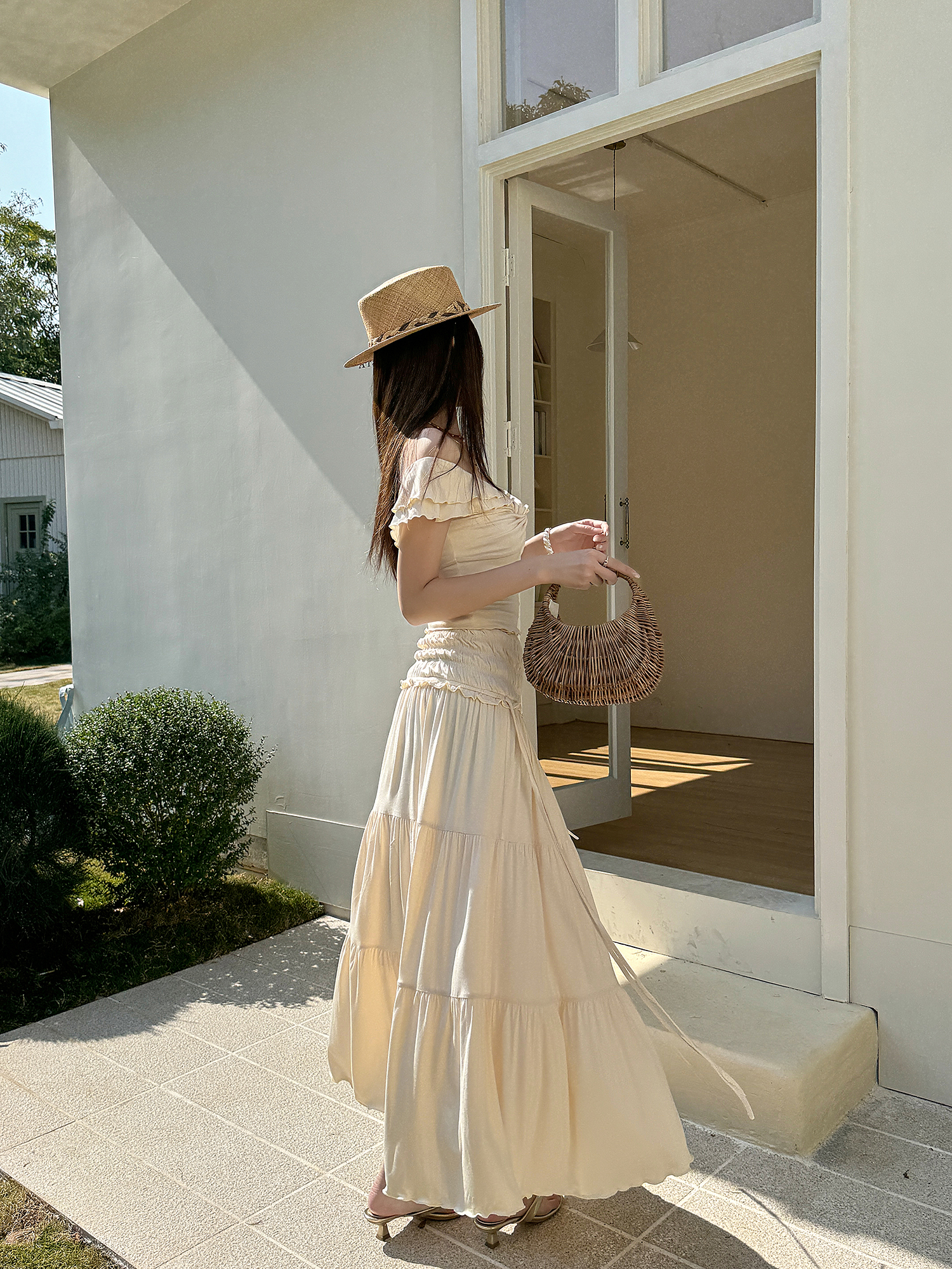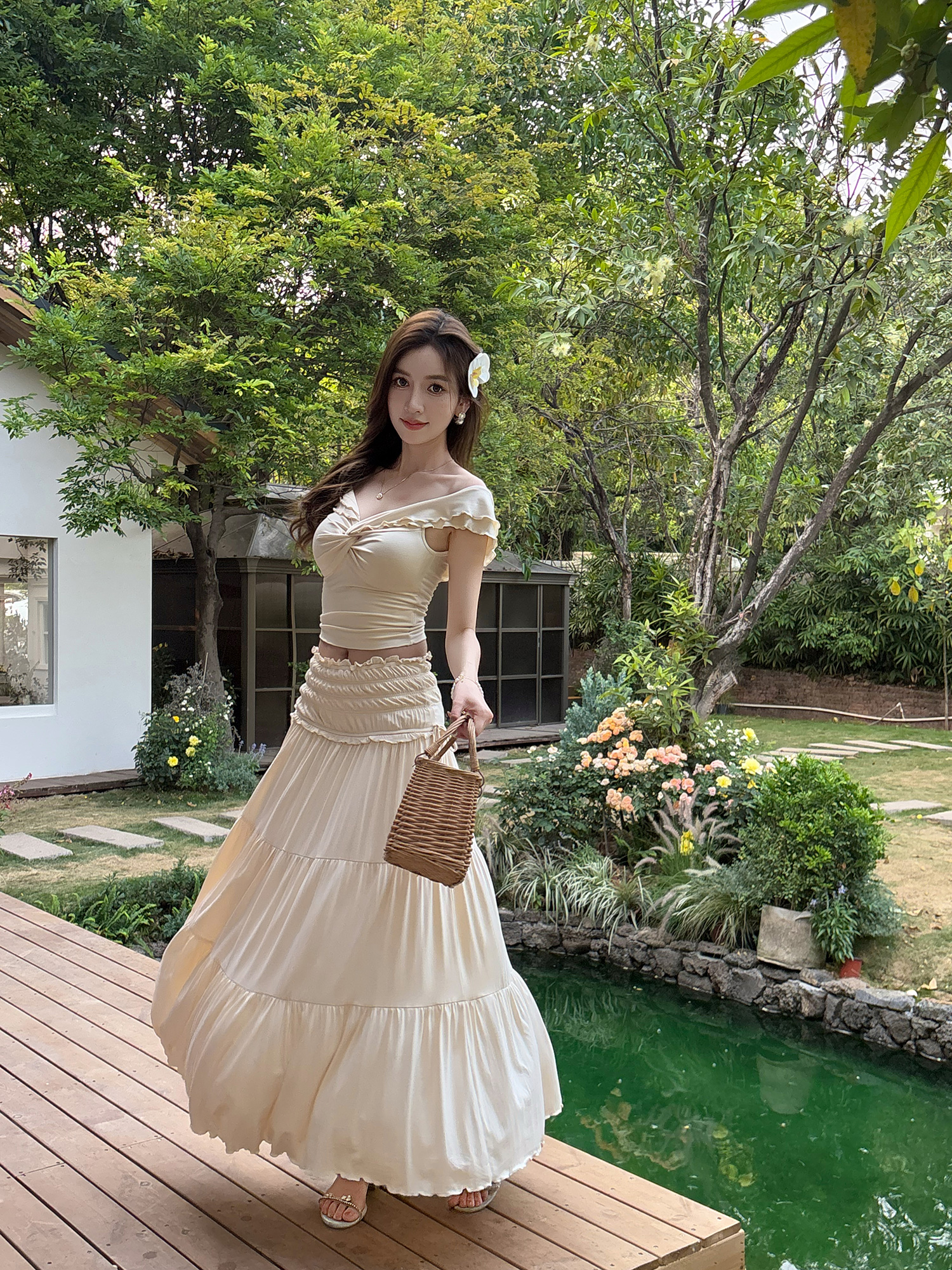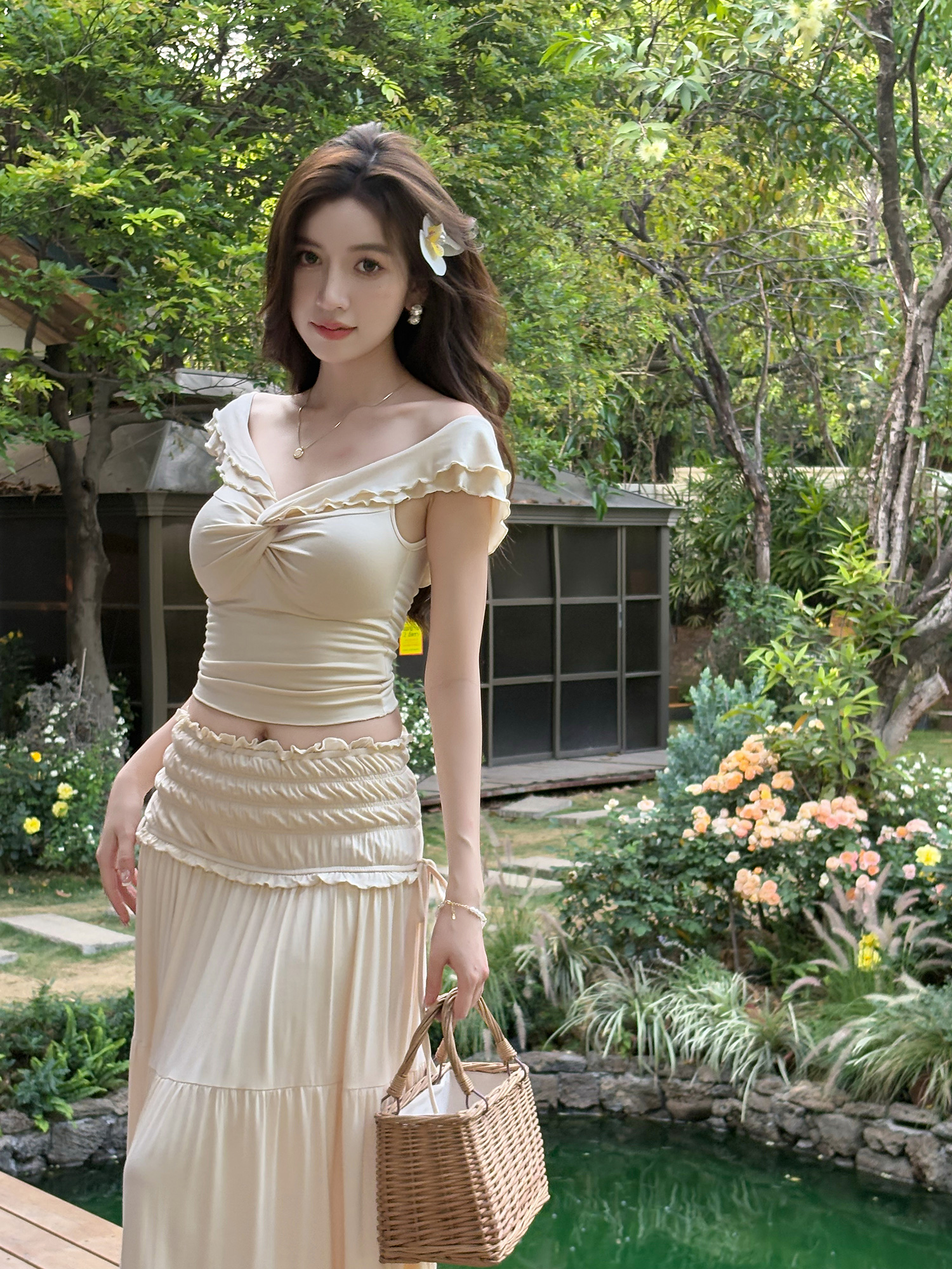 Elevate your summer wardrobe with our Lightweight One-Shoulder French Top featuring playful ear-shaped ruffles, paired perfectly with a flowing elastic long skirt. This chic set offers a flattering fit that accentuates your silhouette while ensuring all-day comfort, making it ideal for beach outings or casual brunches. Embrace effortless style and versatility this season add this stunning ensemble to your cart today and make a statement wherever you go!