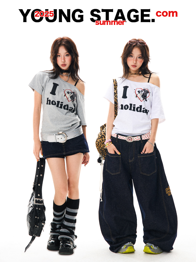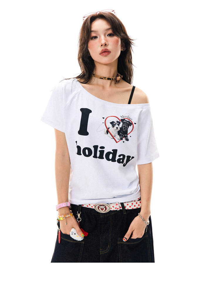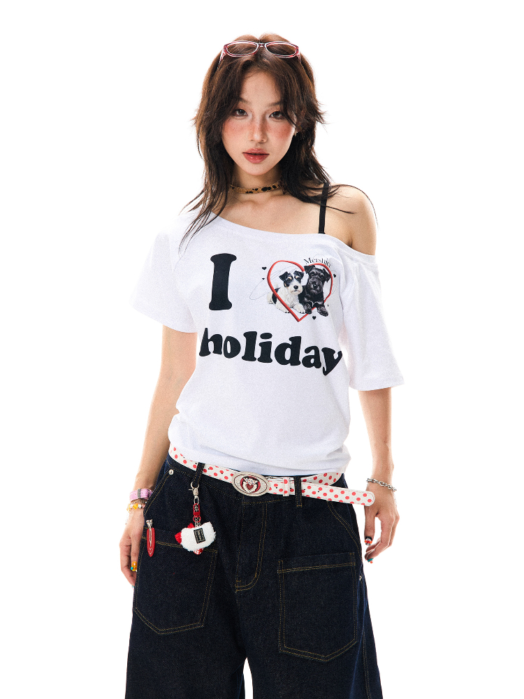 Vintage Off Shoulder Puppy Heart Print Short Sleeve Top for Summer Fits