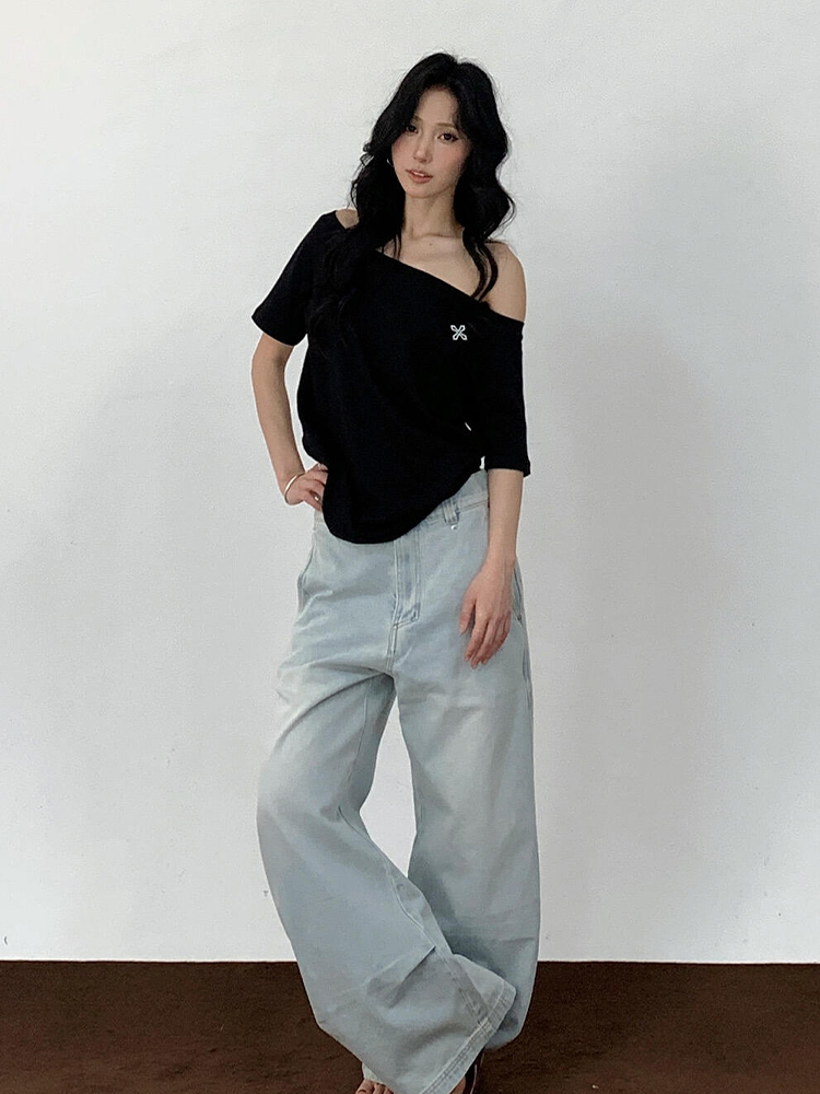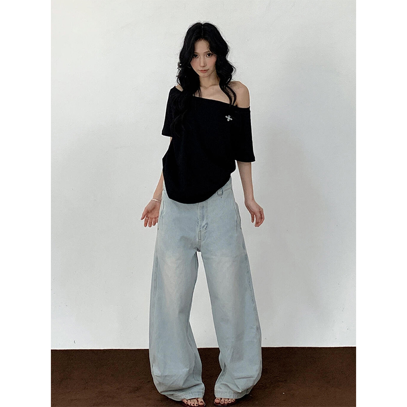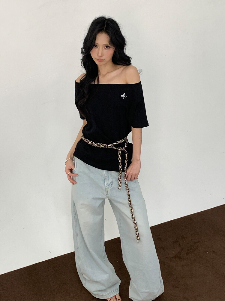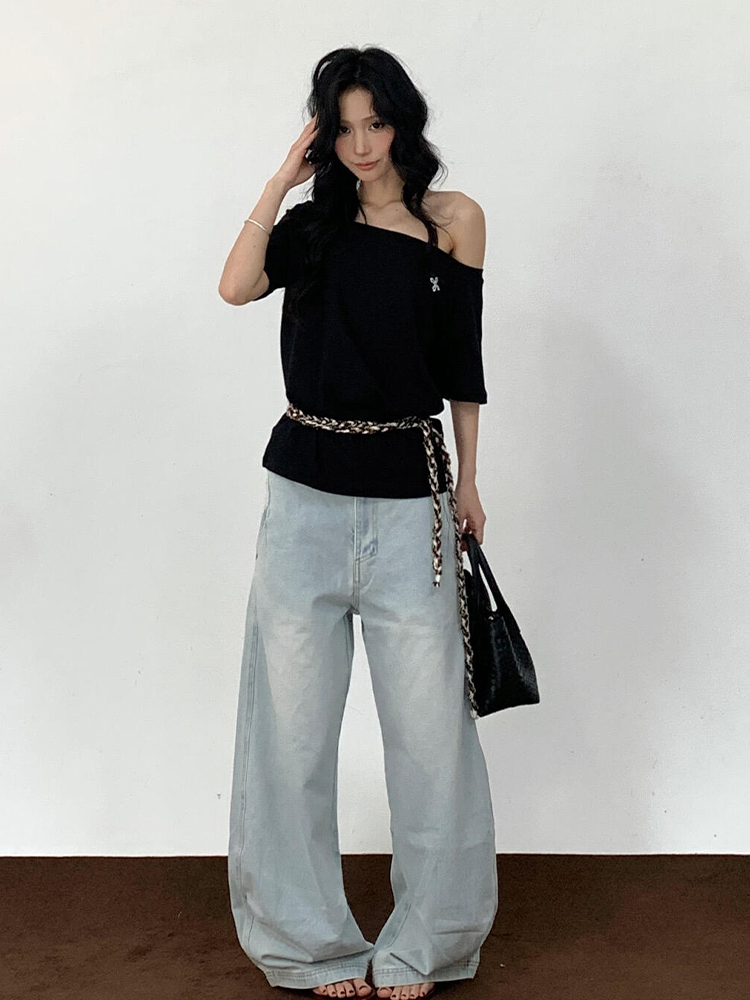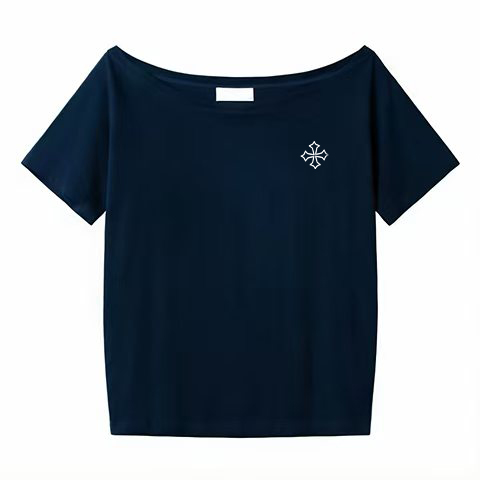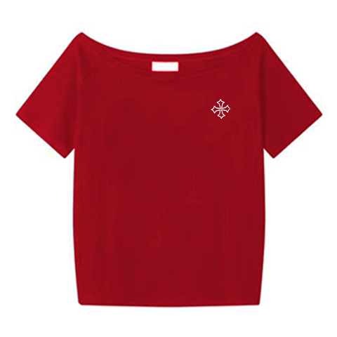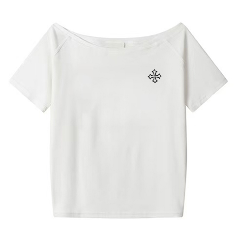 Off Shoulder Short Sleeve Black Cross Print Loose Fit for Summer Fits