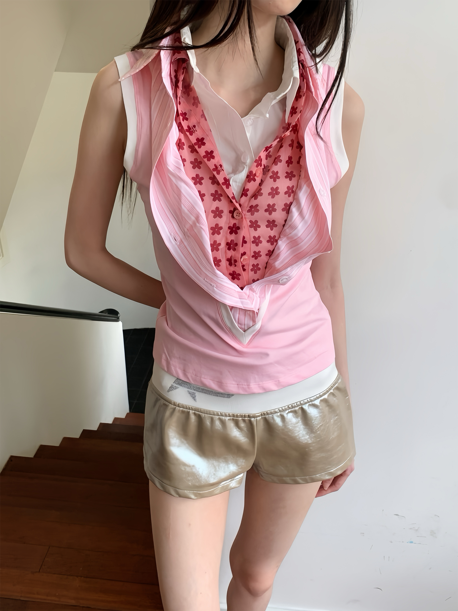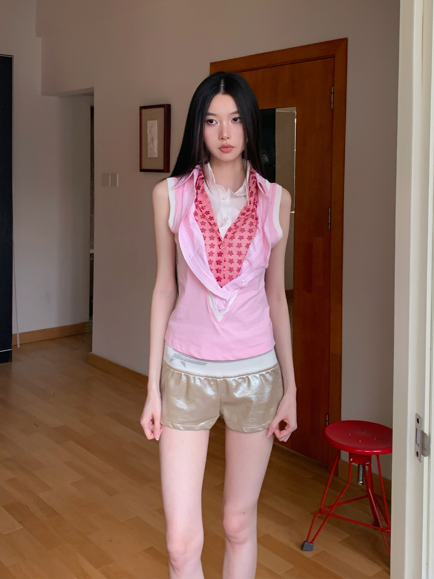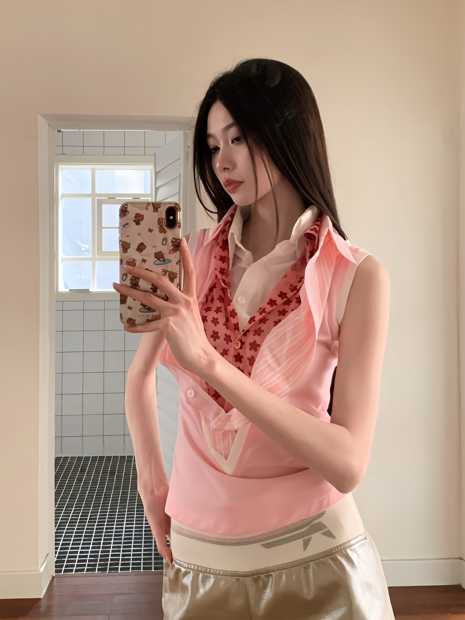 Pretty Outfits: Chic Pink Multi Collar V-neck Short Sleeve Top for Ol Style