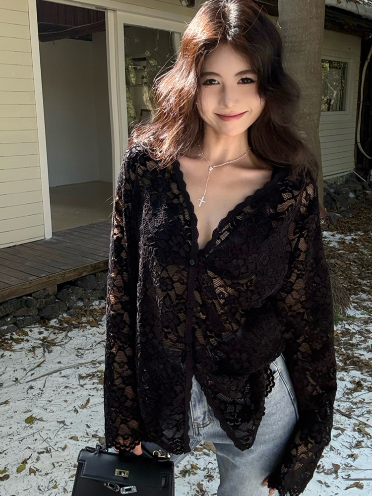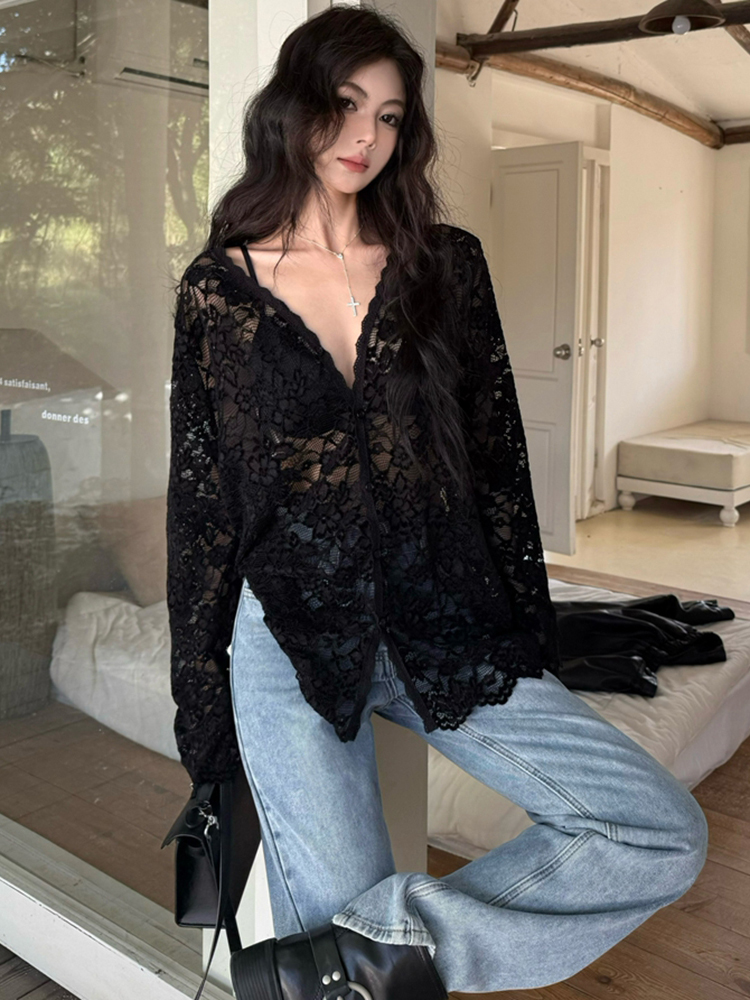 Plus Size V- Neck Long Sleeve Lace Top Women Hollow Out Sheer Blo Autumn Winter, Loose Fit High-quality product featuring fall fits, winter fits, plus size christmas outfit and more. Modern design that fits the latest trends. Premium materials ensure durability and comfort. Order now for special offers! Product designed with attention to every detail. Suitable for all occasions and personal styles.