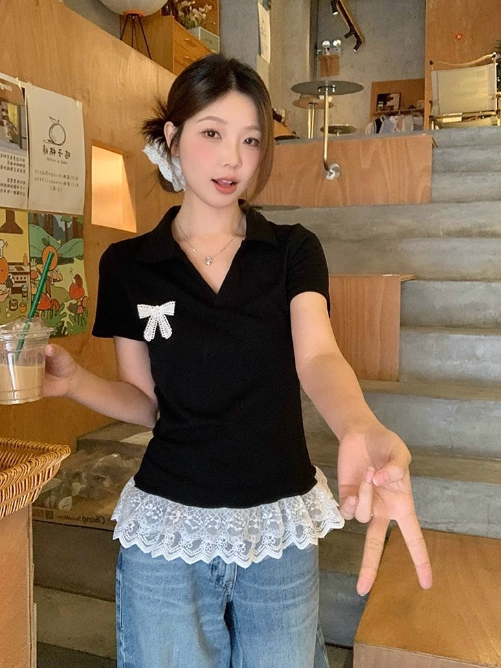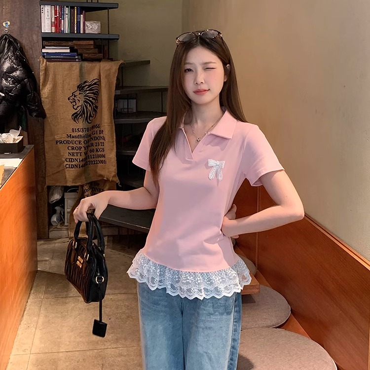 Elevate your summer wardrobe with our Plus-Size Women’s Lace Patchwork Bow Short-Sleeve T-Shirt, designed for curvy girls who love to embrace their style. This sweet and slimming lapel top features delicate lace accents and a charming bow detail, offering a flattering fit that accentuates your curves while keeping you comfortable all day long. Perfect for casual outings or dressy occasions, this versatile tee pairs beautifully with your favorite jeans or skirts. Don’t miss out on this must-have piece add to your cart and step out in style!