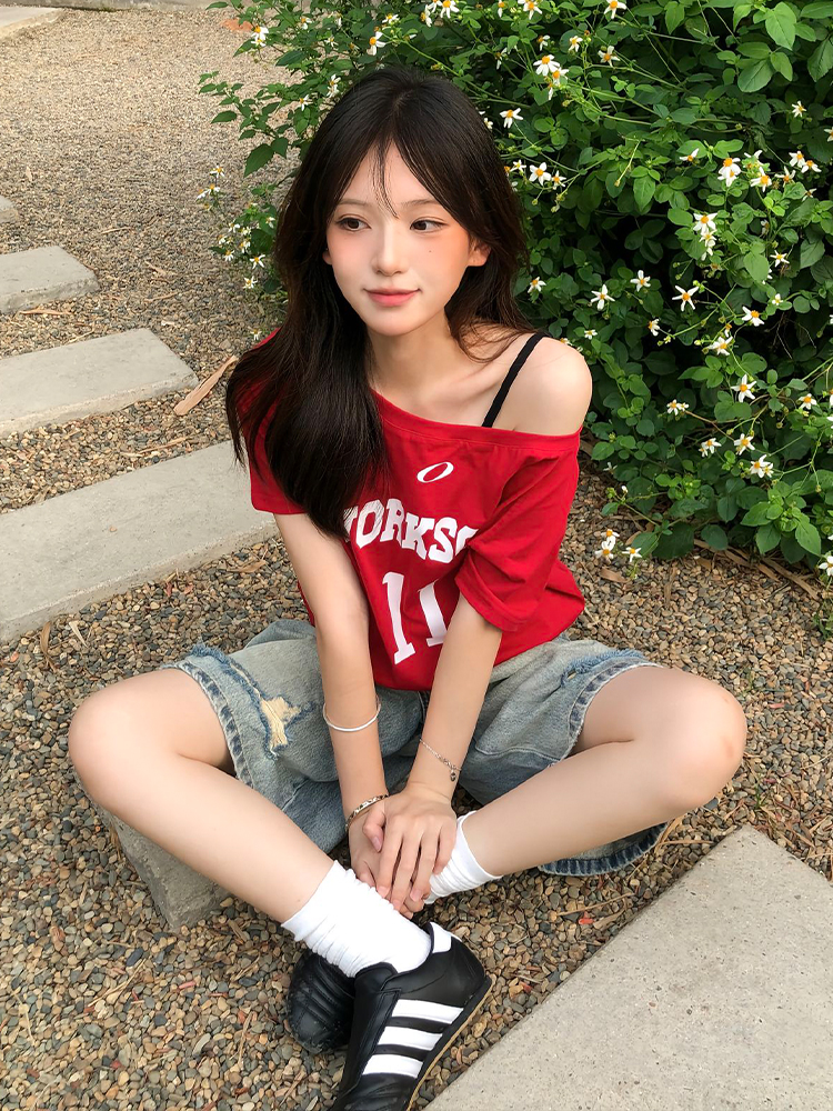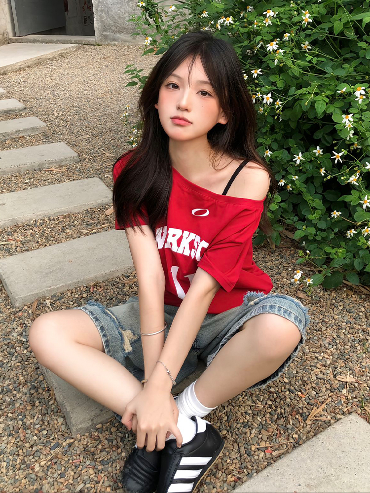Red One Shoulder Short Sleeve Women Summer Letter Print Casua – Summer Fits