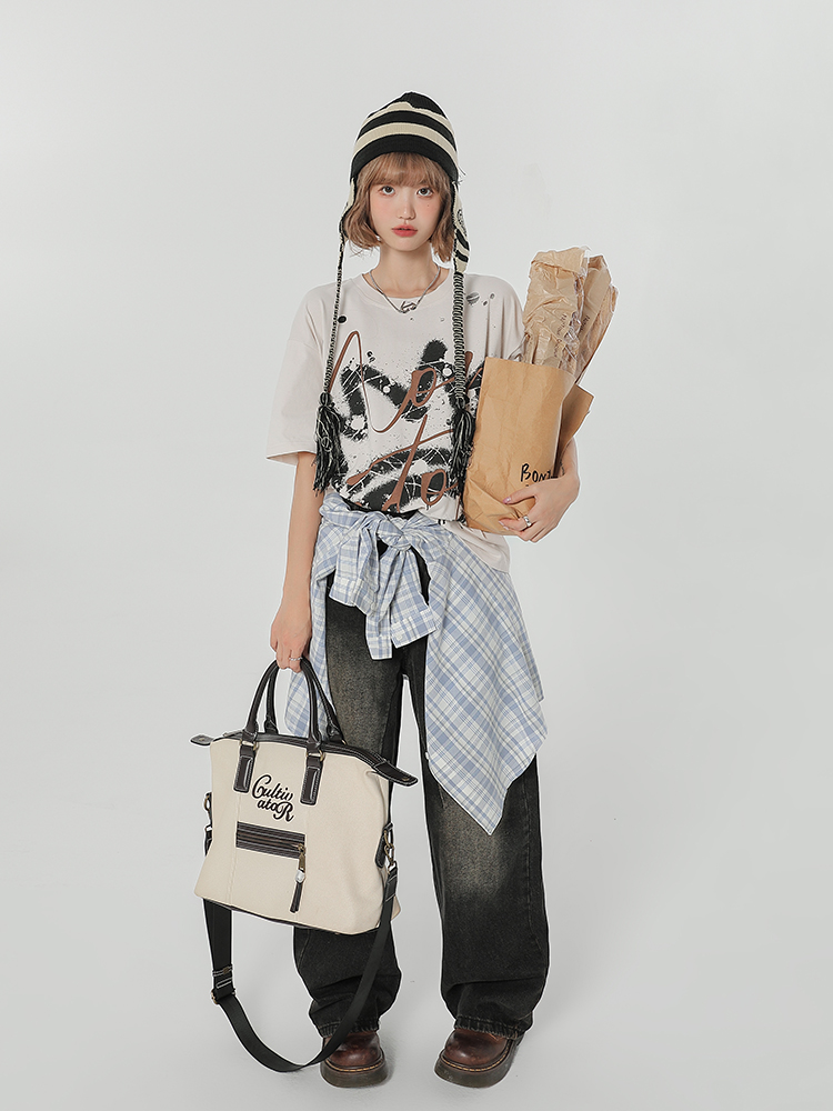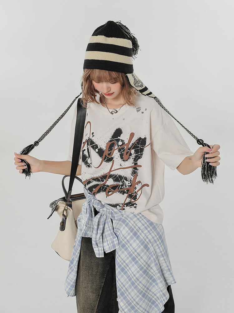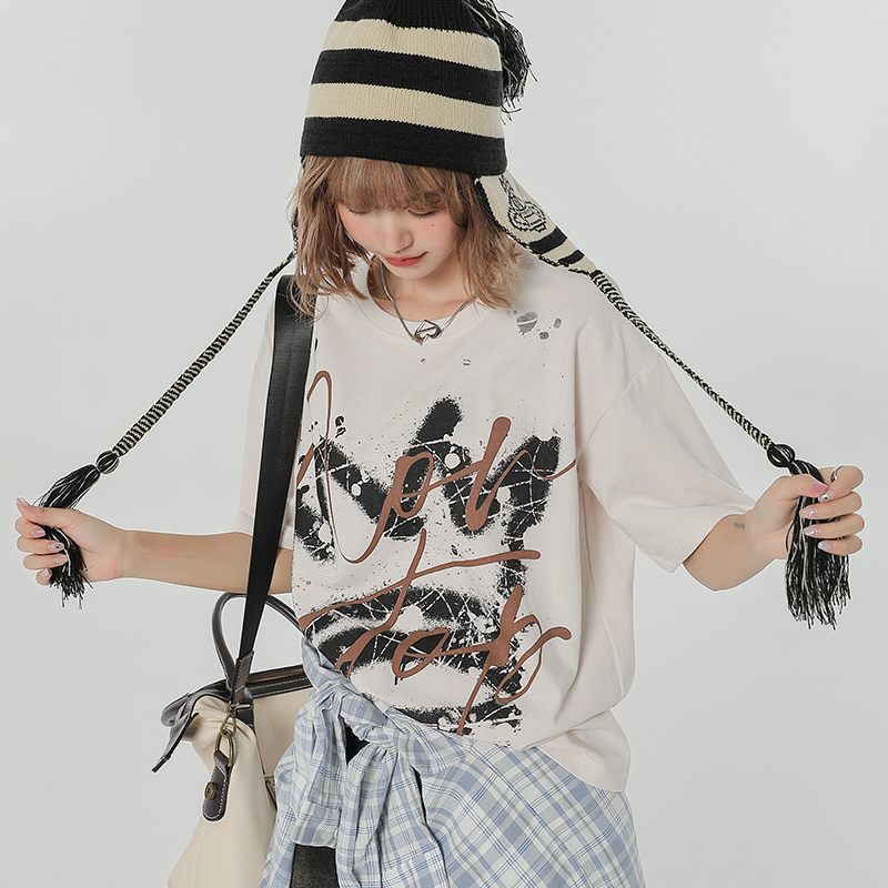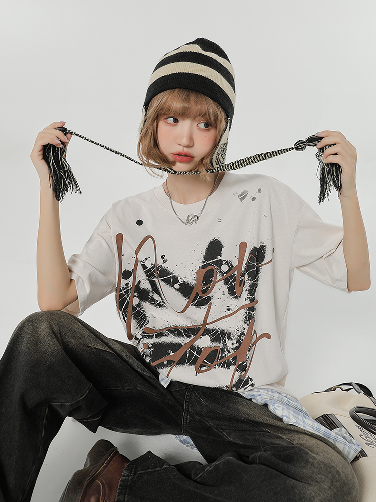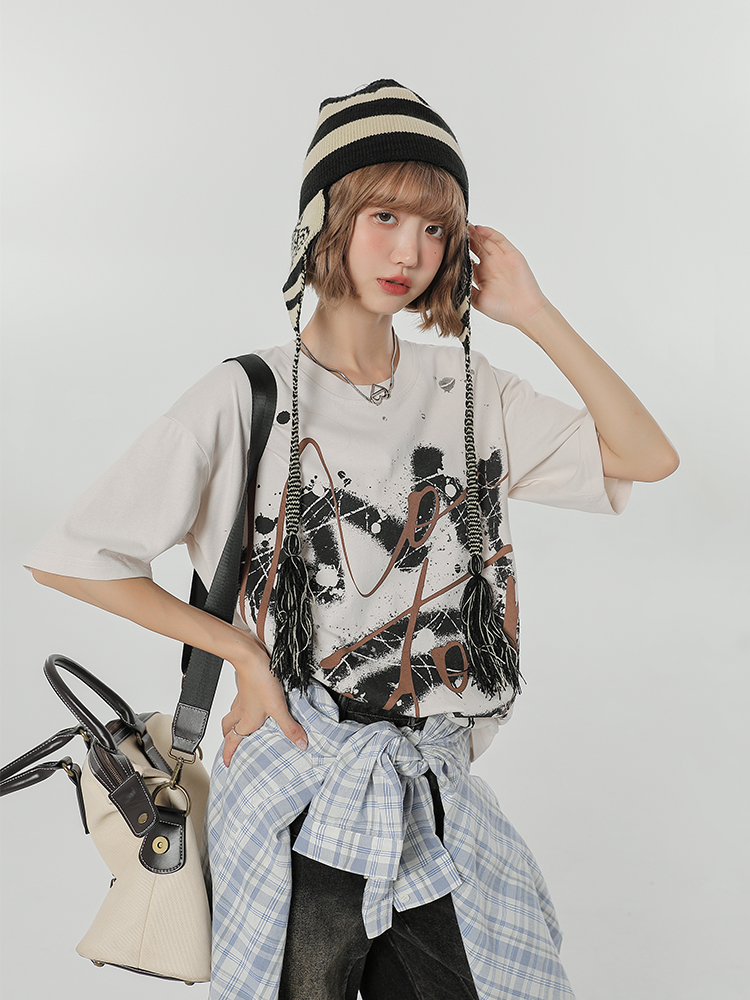 Retro Graffiti Print Neck Short Sleeve Top for Stylish Summer Fits