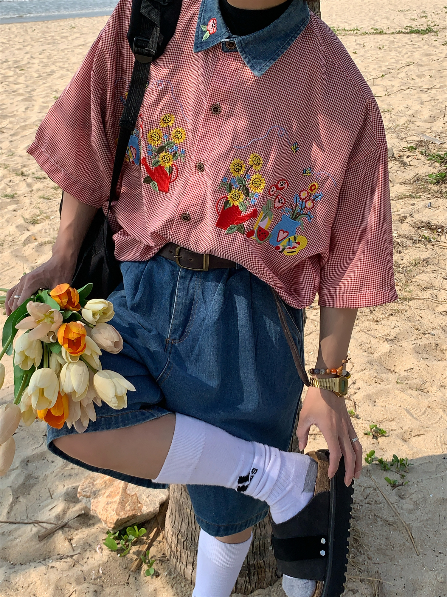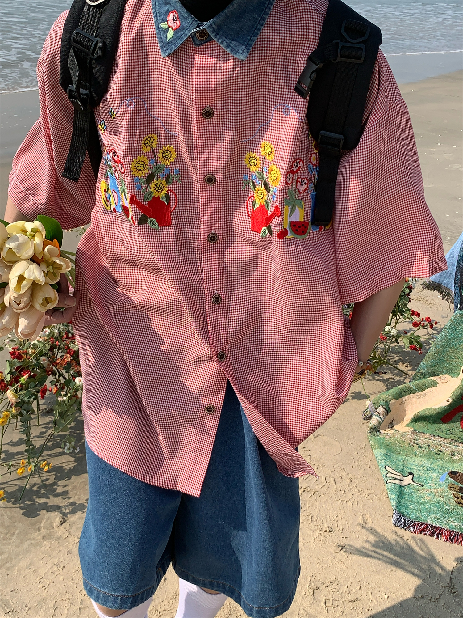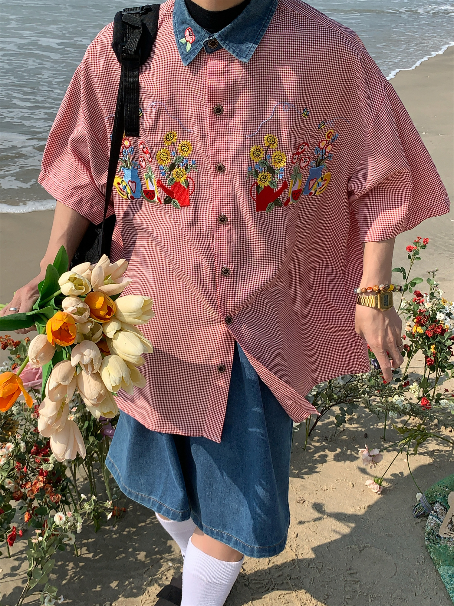 Embrace the essence of summer with our Retro Fun Floral Embroidery Shirt featuring a chic denim collar. This short sleeve plaid top is designed for couples who love to express their unique style with a touch of Y2K flair. Crafted for a comfortable fit, it combines playful floral accents with a trendy denim detail, making it perfect for casual outings or laid-back date nights. Don’t miss out on this must-have addition to your wardrobe add it to your cart today and step out in style!