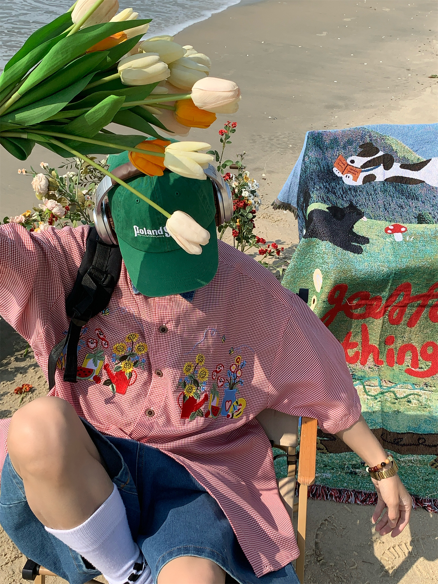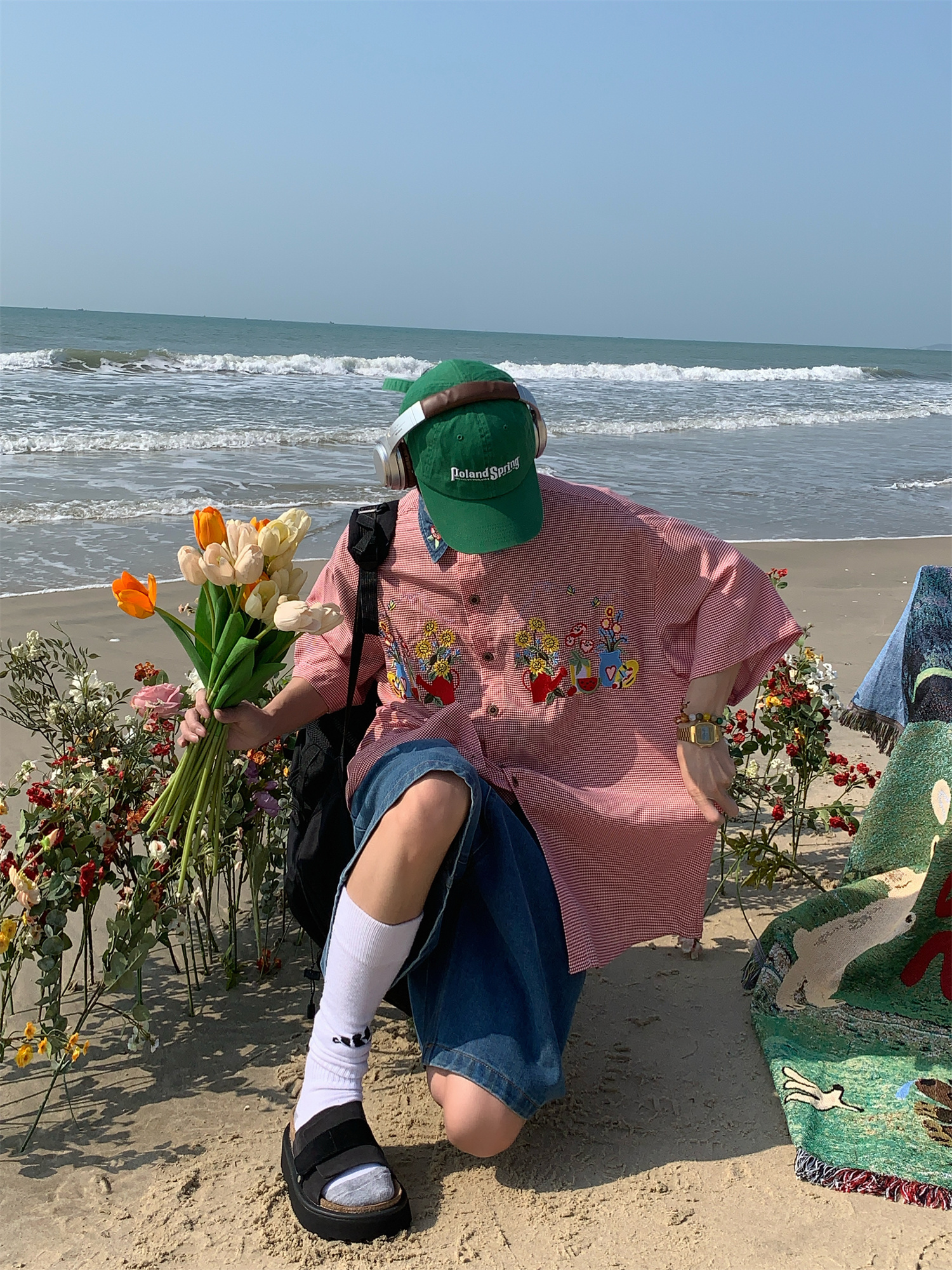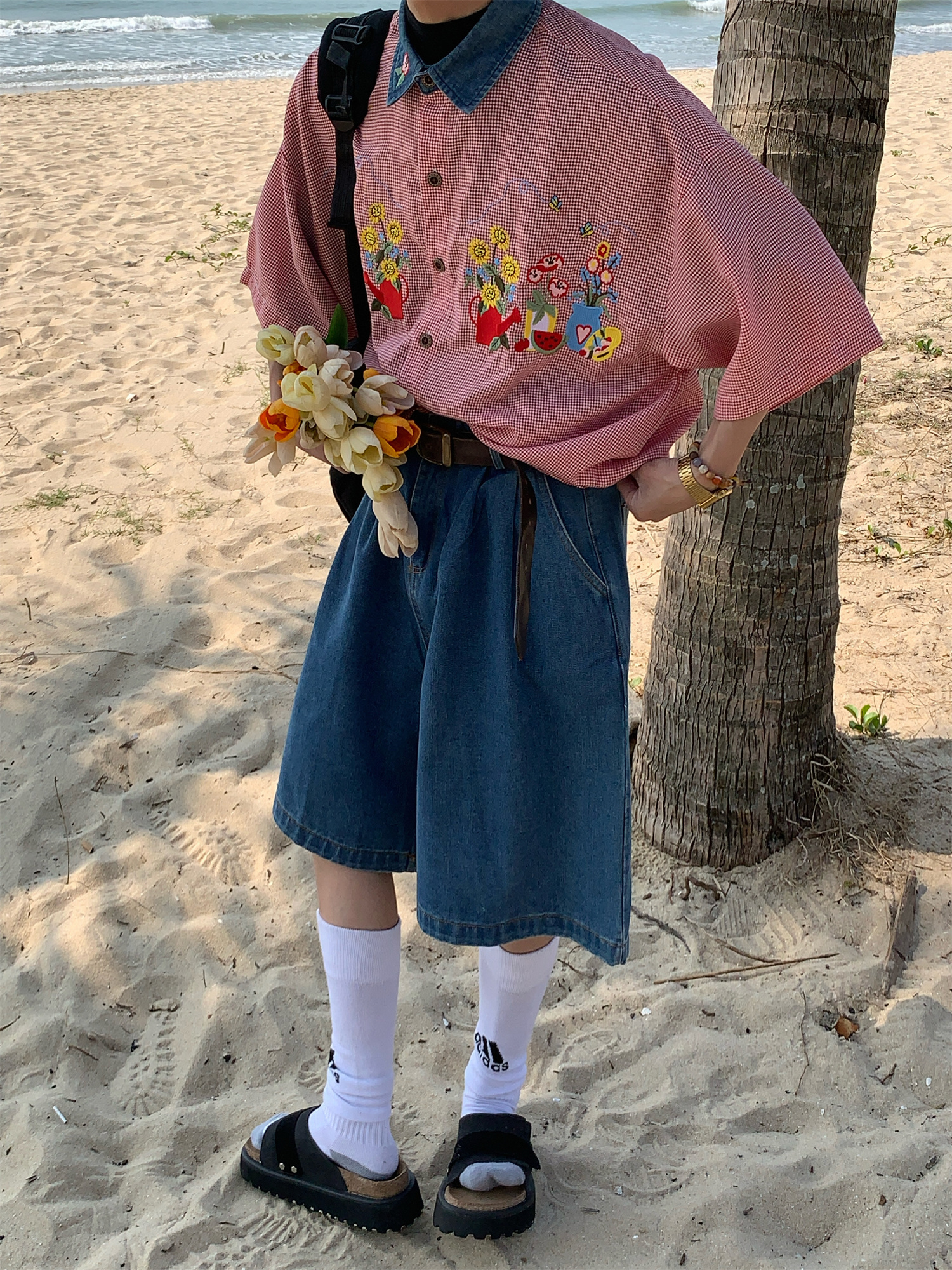 Embrace the essence of summer with our Retro Fun Floral Embroidery Shirt featuring a chic denim collar. This short sleeve plaid top is designed for couples who love to express their unique style with a touch of Y2K flair. Crafted for a comfortable fit, it combines playful floral accents with a trendy denim detail, making it perfect for casual outings or laid-back date nights. Don’t miss out on this must-have addition to your wardrobe add it to your cart today and step out in style!