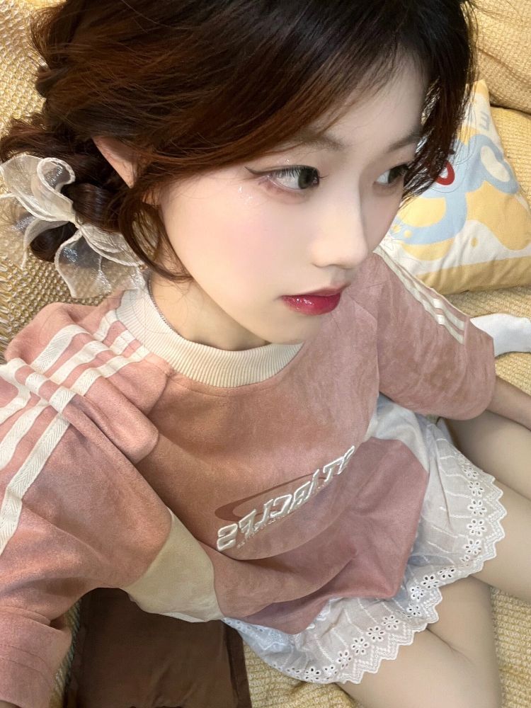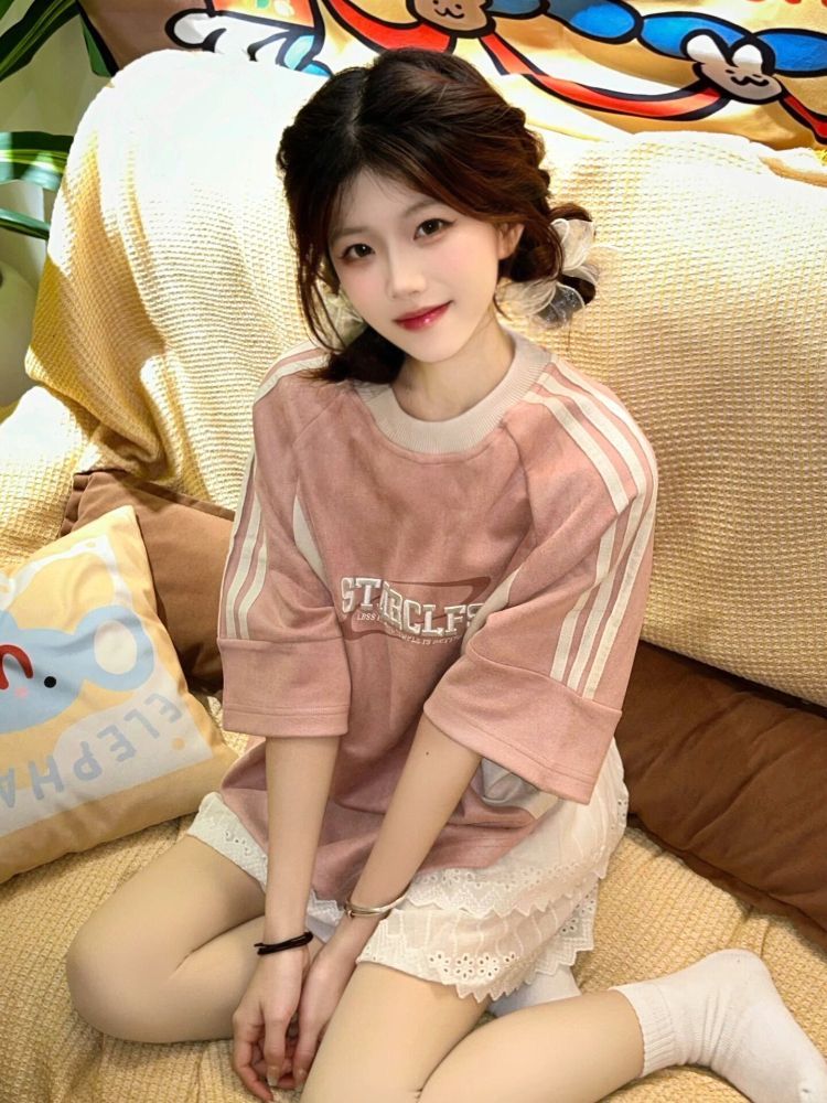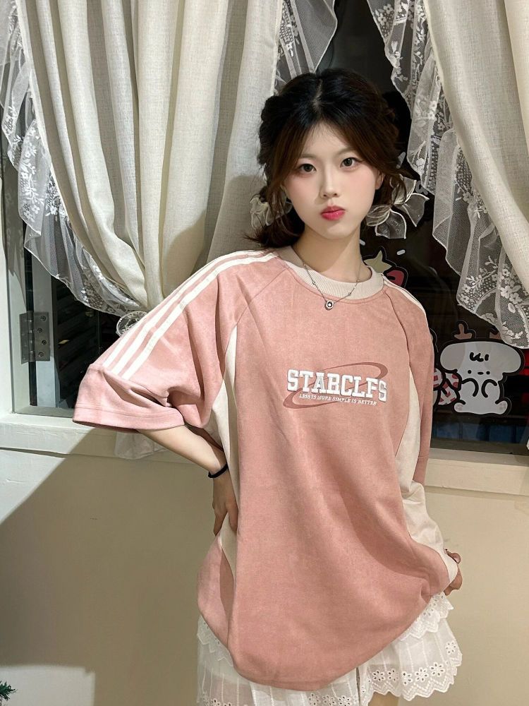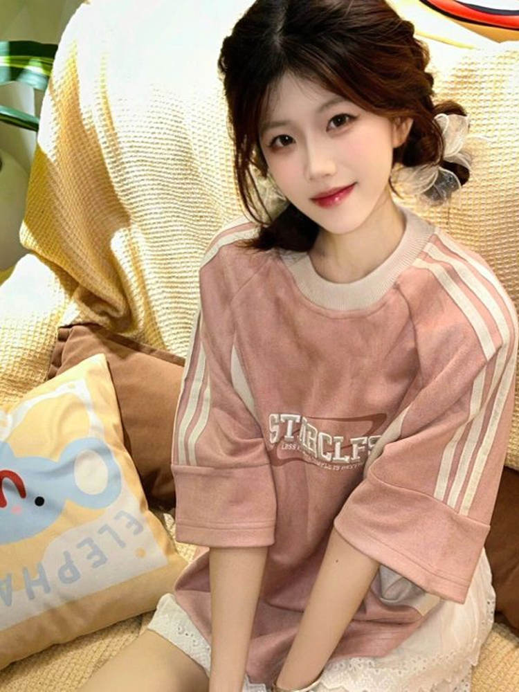 Stylish Pink Suede Short Sleeve Three Stripe Raglan Top for Summer Fits