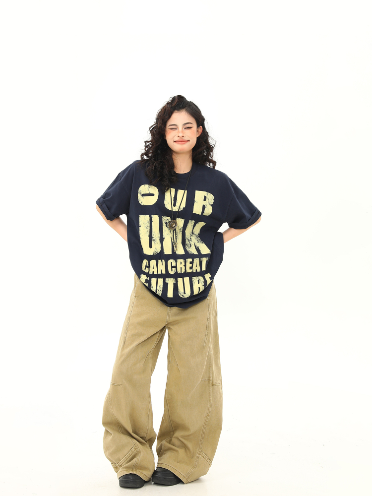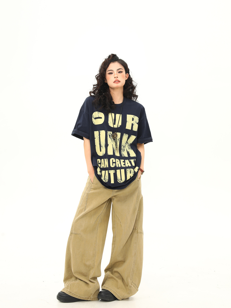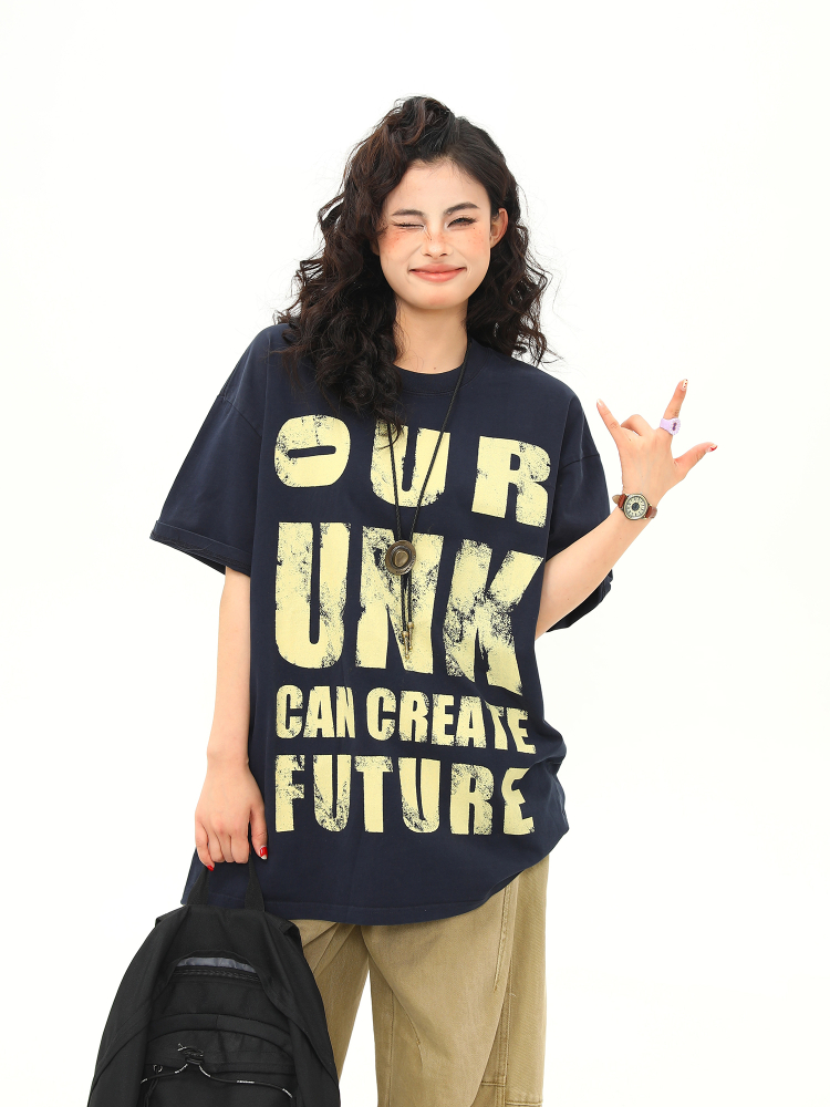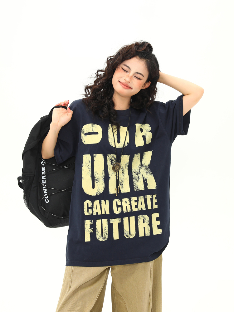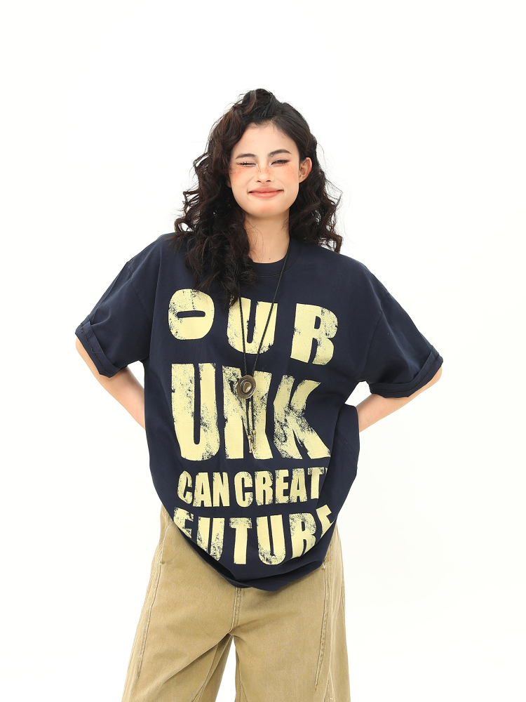 Vintage Letter Print Short Sleeve Top for Easy Couple Costumes
