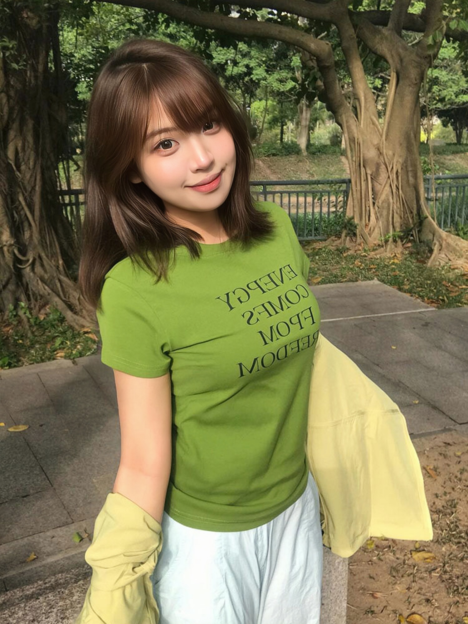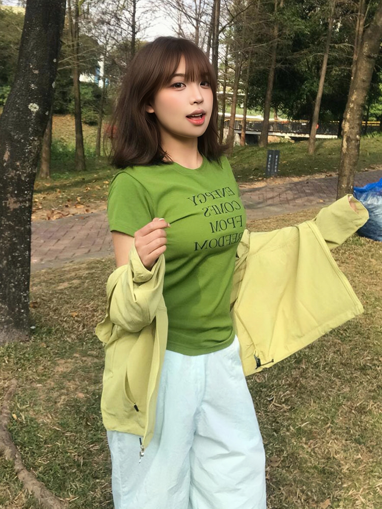 Vintage Green Letter Print Slim Fit Short Sleeve Top for Summer Fits