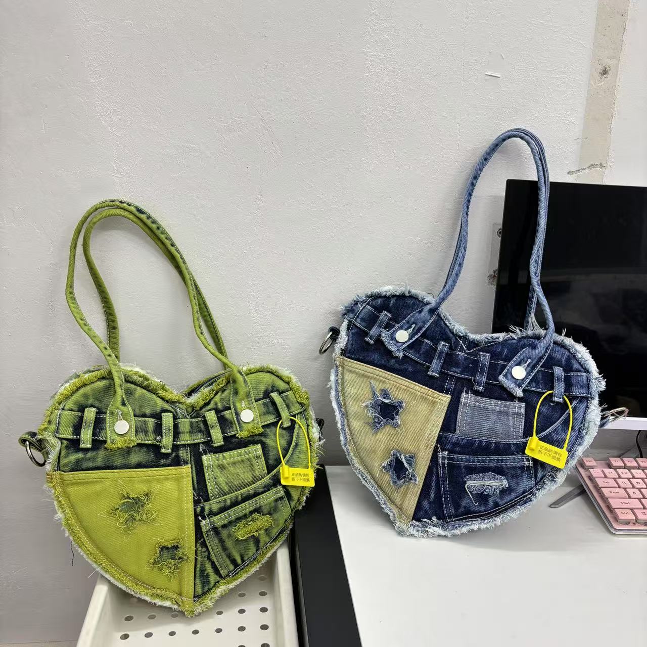 Vintage Patchwork Washed Fringe Denim Heart Crossbody Bag for Y2k Outfits