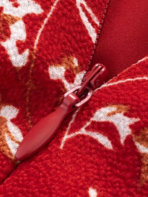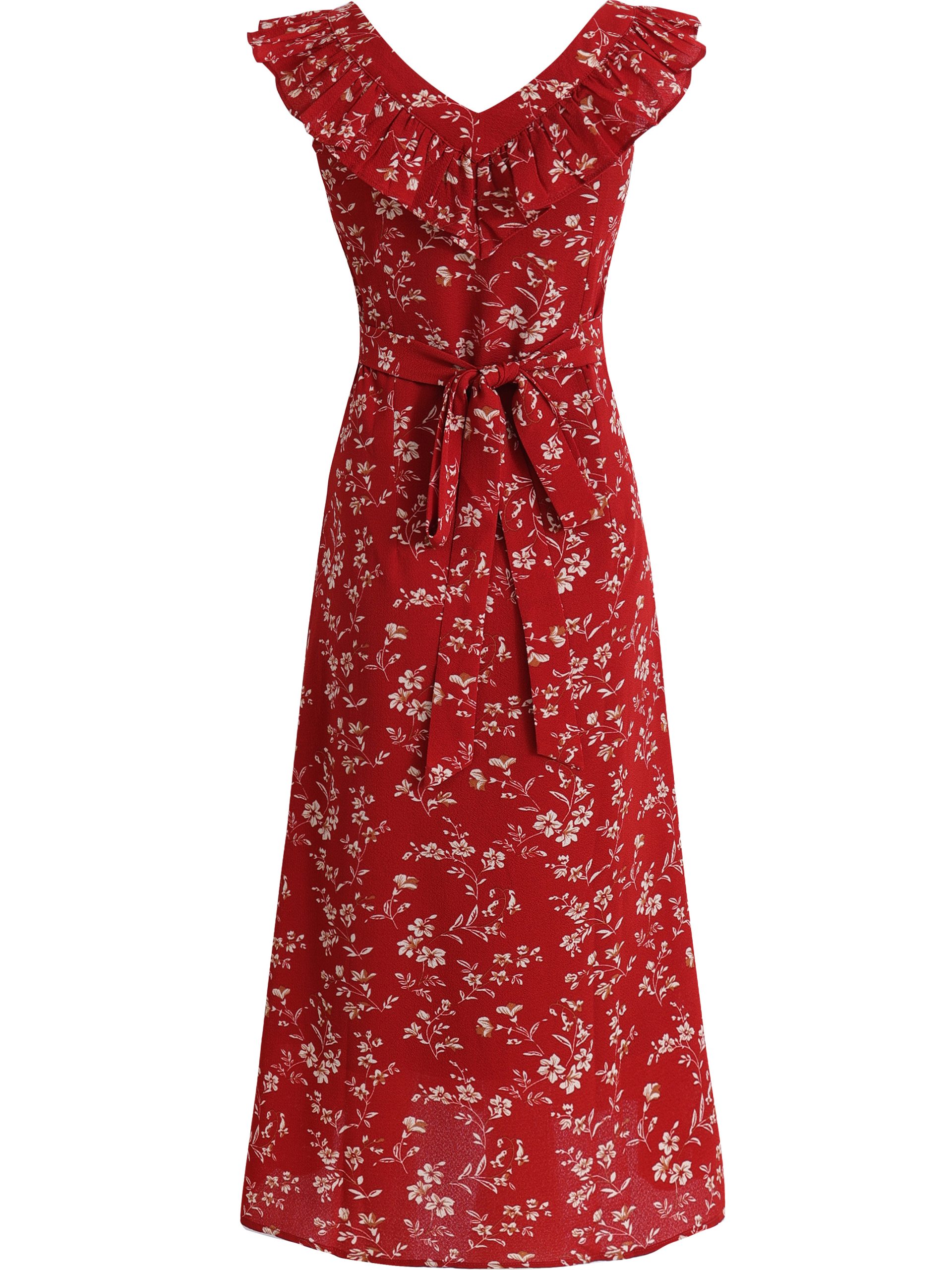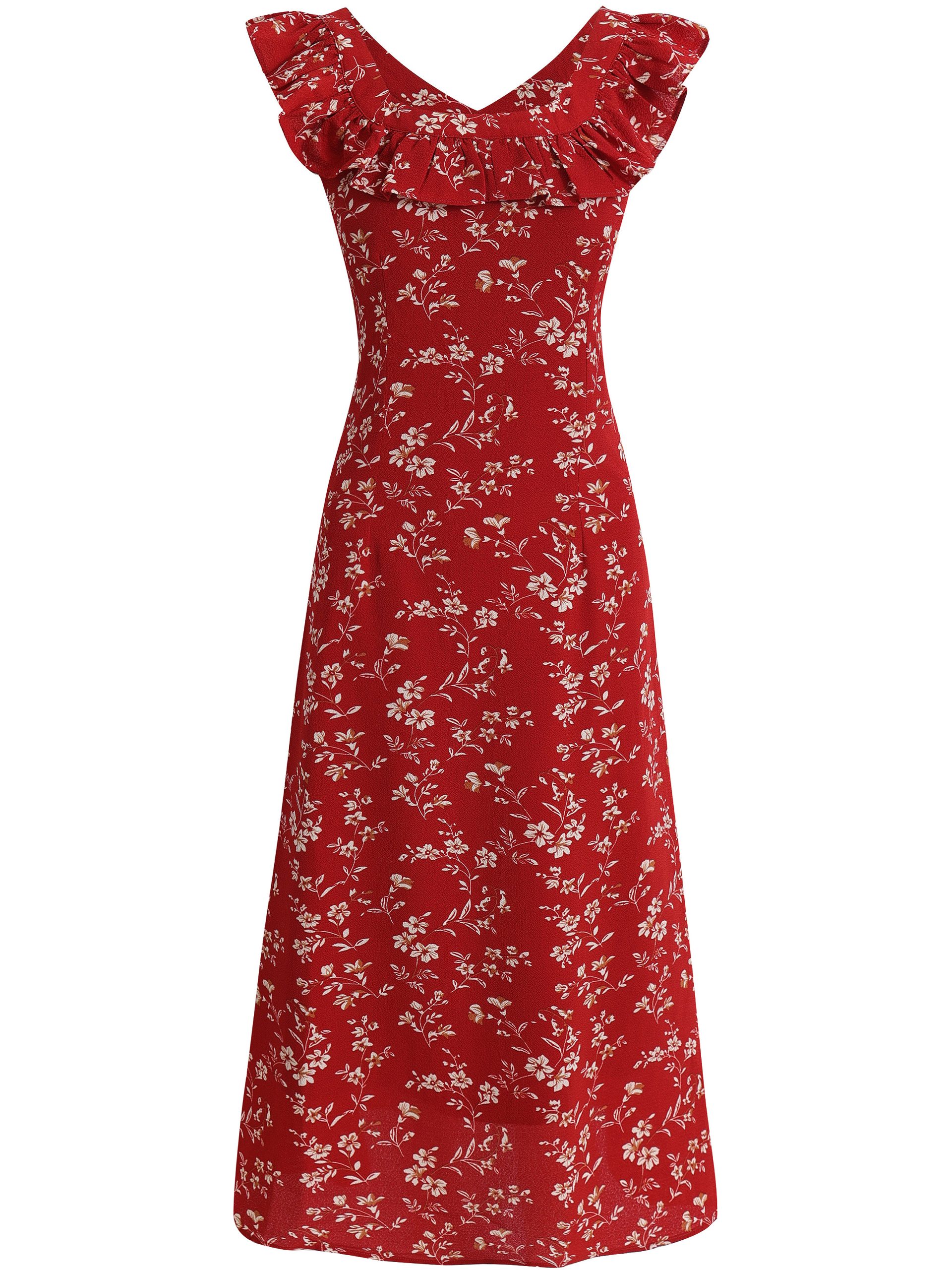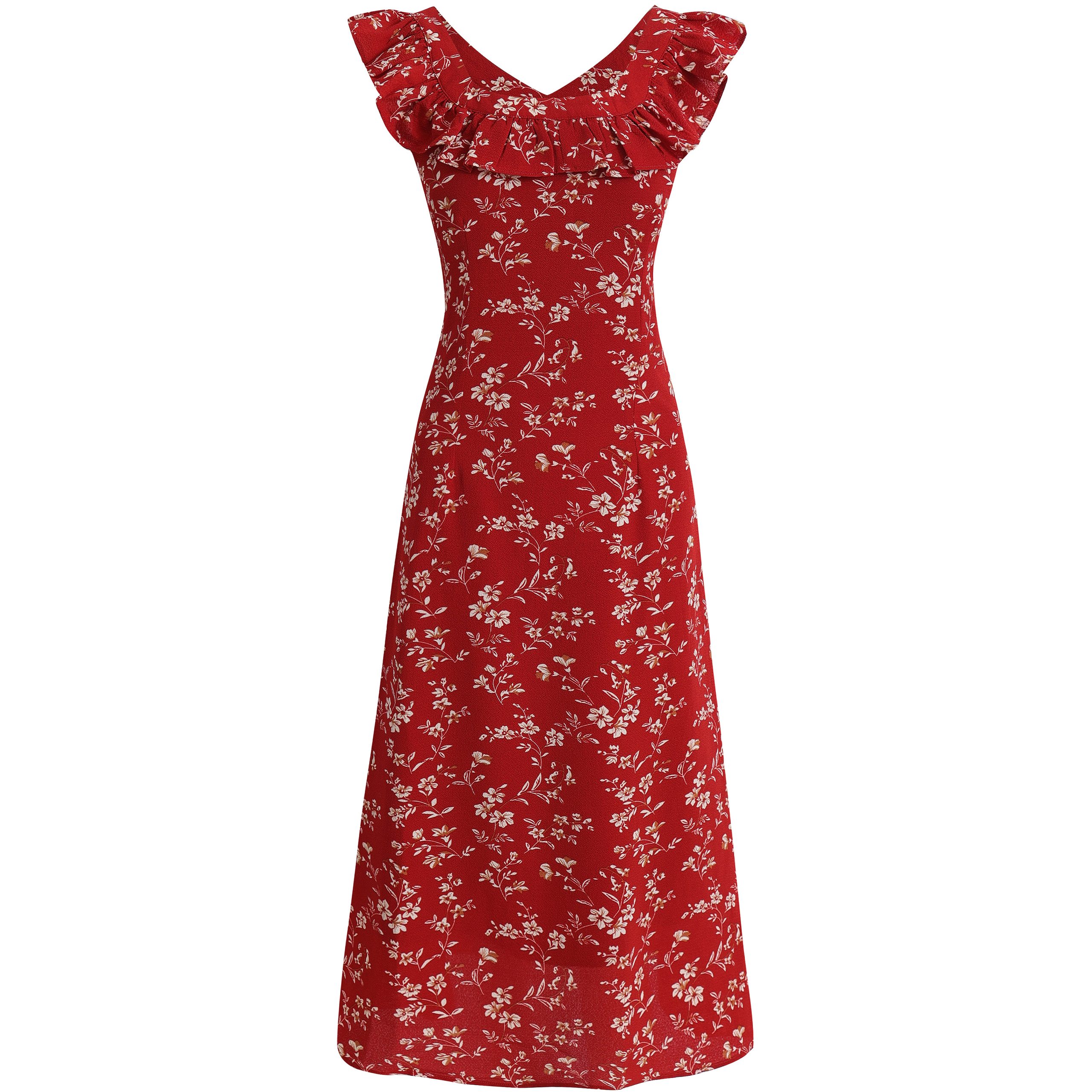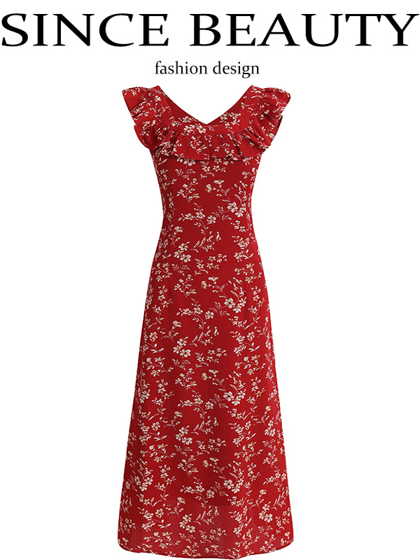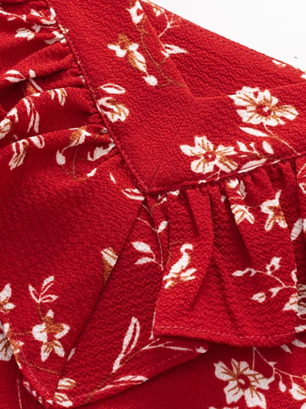Vintage Red Floral V-neck Ruffle Hem Sling Dress for Y2k Outfits