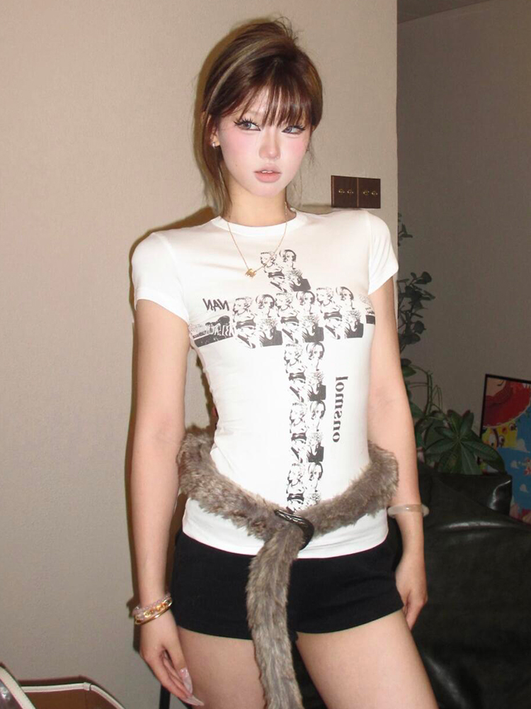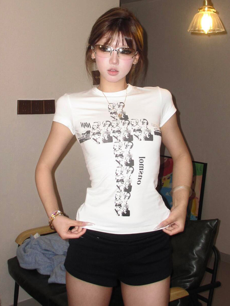 Elevate your summer wardrobe with our Y2K American Style Fitted Short Sleeve T-Shirt for Women, featuring a trendy band character print that captures the essence of retro vibes. This slim-fit white top is designed to flatter your figure while providing ultimate comfort, making it perfect for casual outings or laid-back days at home. Pair it with your favorite jeans or shorts for an effortlessly chic look. Don’t miss out on this stylish essential add it to your cart today!