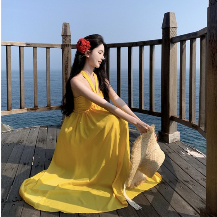 Step into summer with our stunning Yellow Backless Halter Dress, designed for the ultimate seaside vacation experience. This sexy summer style features a flattering fit that accentuates your silhouette, while the long beach skirt flows gracefully with every step, ensuring you feel both comfortable and chic. Perfect for beach parties or sunset strolls, this dress is a must-have for your warm-weather wardrobe. Don’t miss out on making a statement add this gorgeous piece to your cart today!