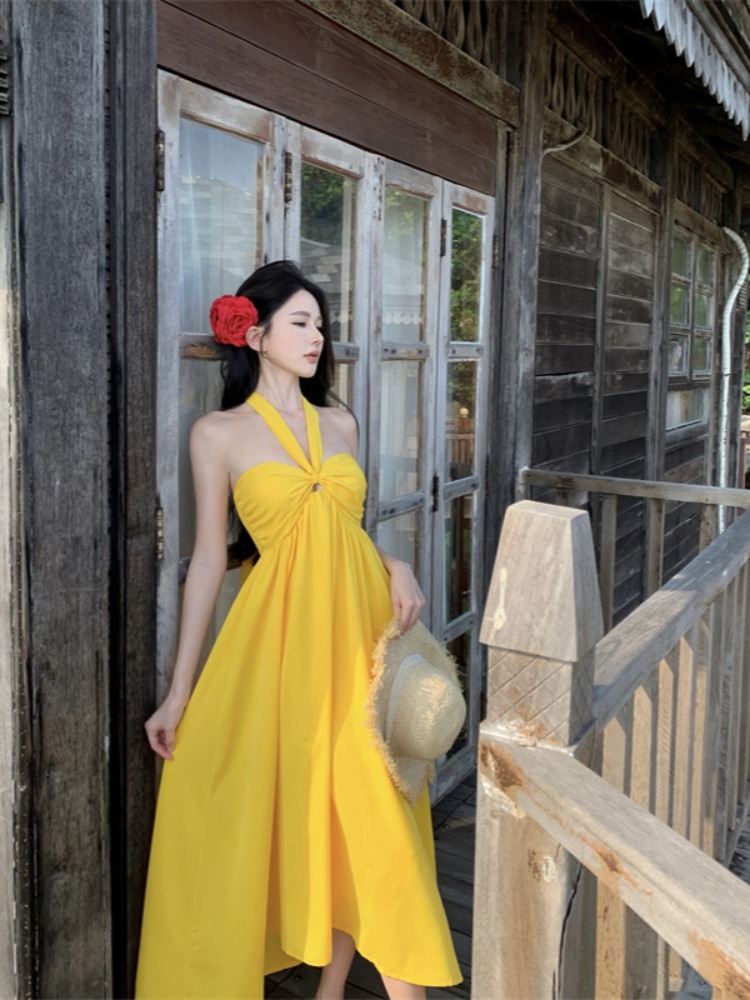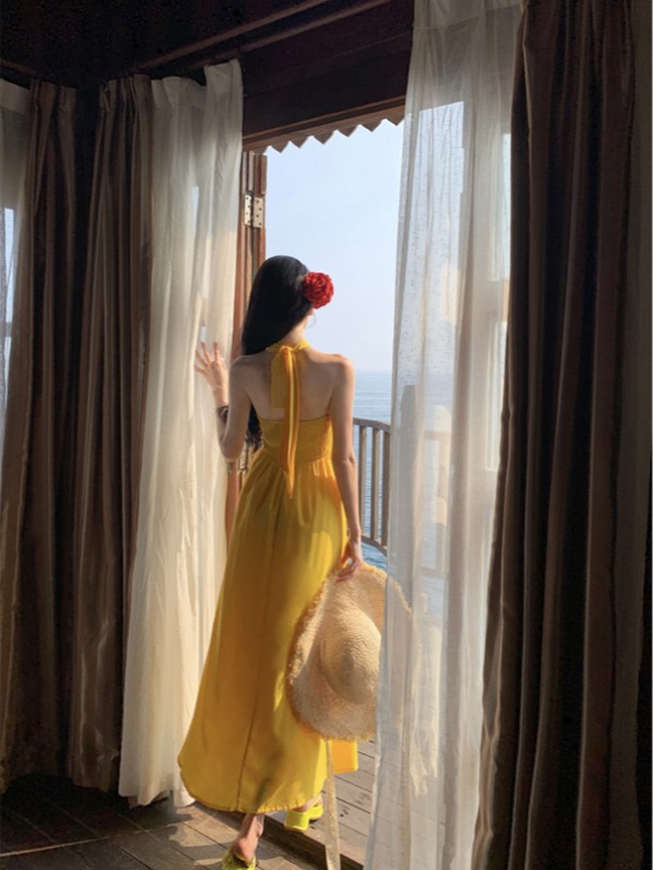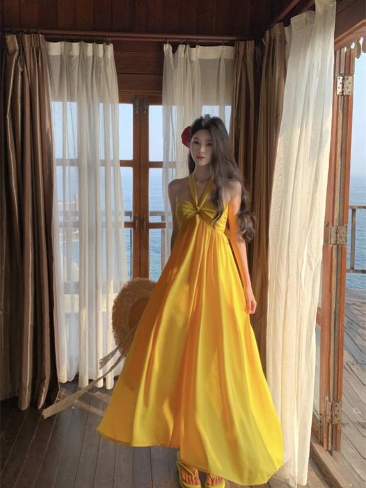 Yellow Backless Halter Dress Long Beach Skirt Summer High-quality product featuring casual summer outfits, vacation outfits, skirt outfits and more. Modern design that fits the latest trends. Premium materials ensure durability and comfort. Order now for special offers! Product designed with attention to every detail. Suitable for all occasions and personal styles.